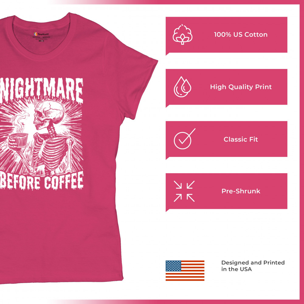 Show off your love for coffee with this quirky "Nightmare Before Coffee" skeleton design, blending humor and gothic style for caffeine lovers.