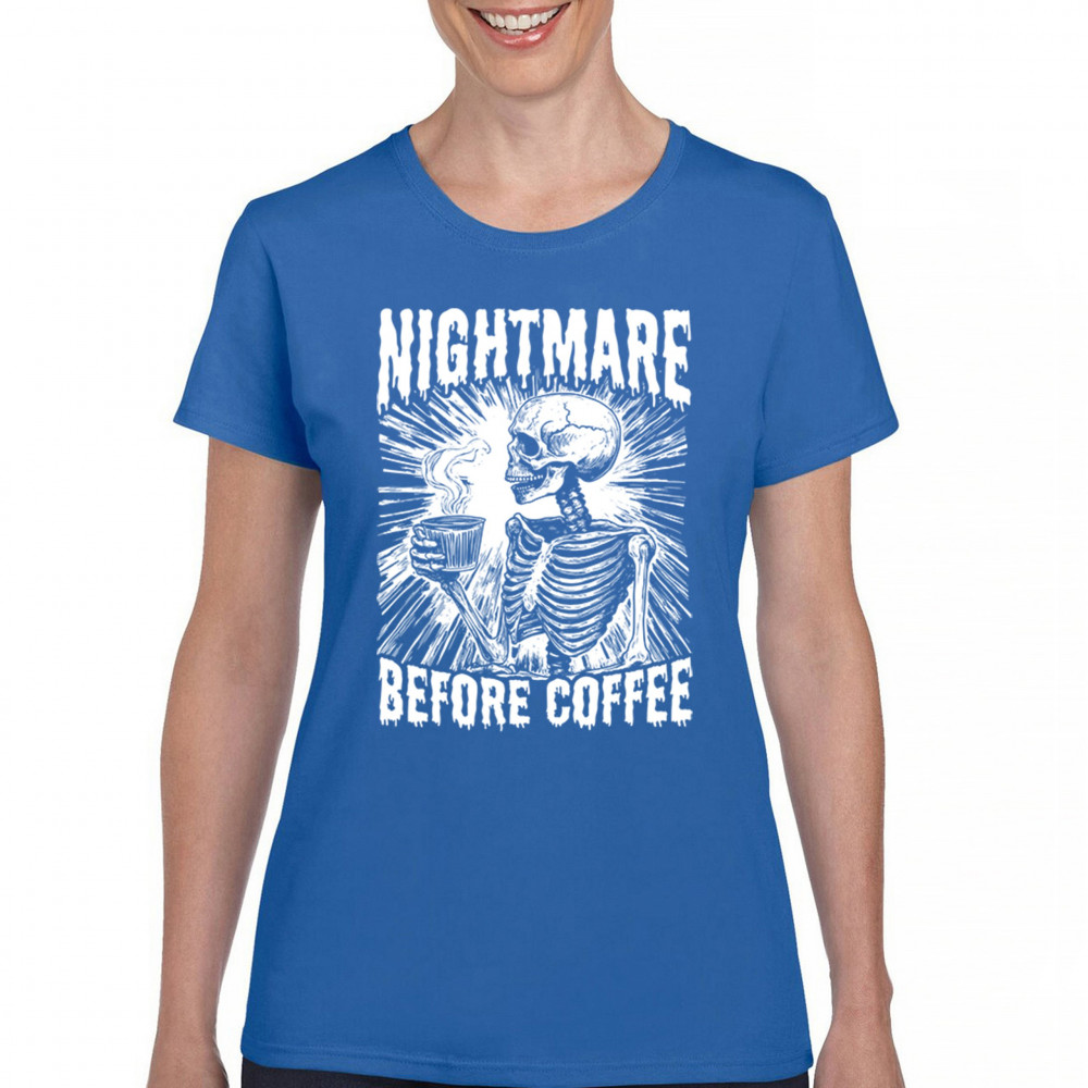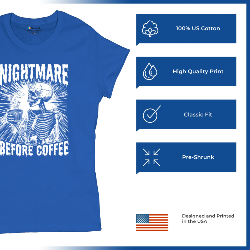 Show off your love for coffee with this quirky "Nightmare Before Coffee" skeleton design, blending humor and gothic style for caffeine lovers.