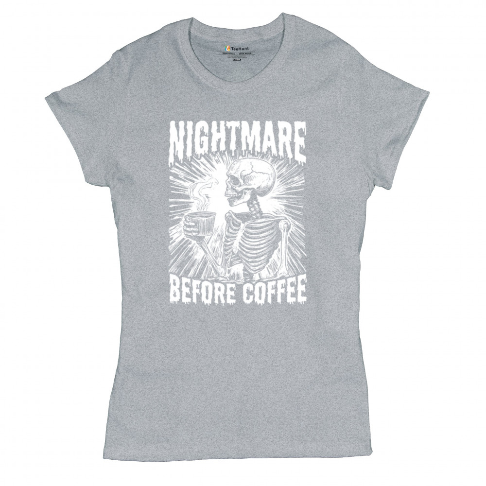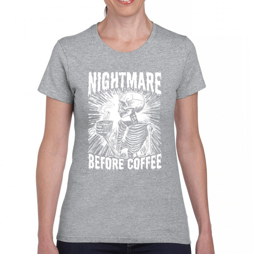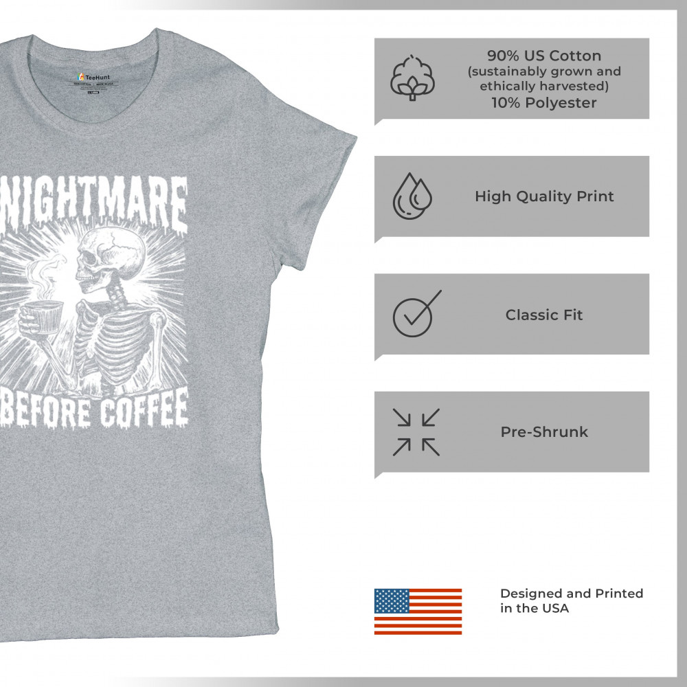 Show off your love for coffee with this quirky "Nightmare Before Coffee" skeleton design, blending humor and gothic style for caffeine lovers.