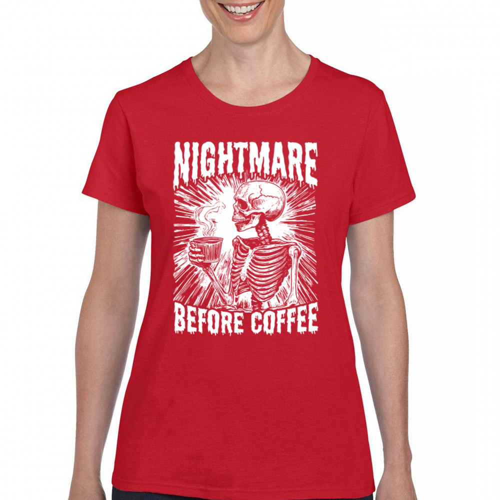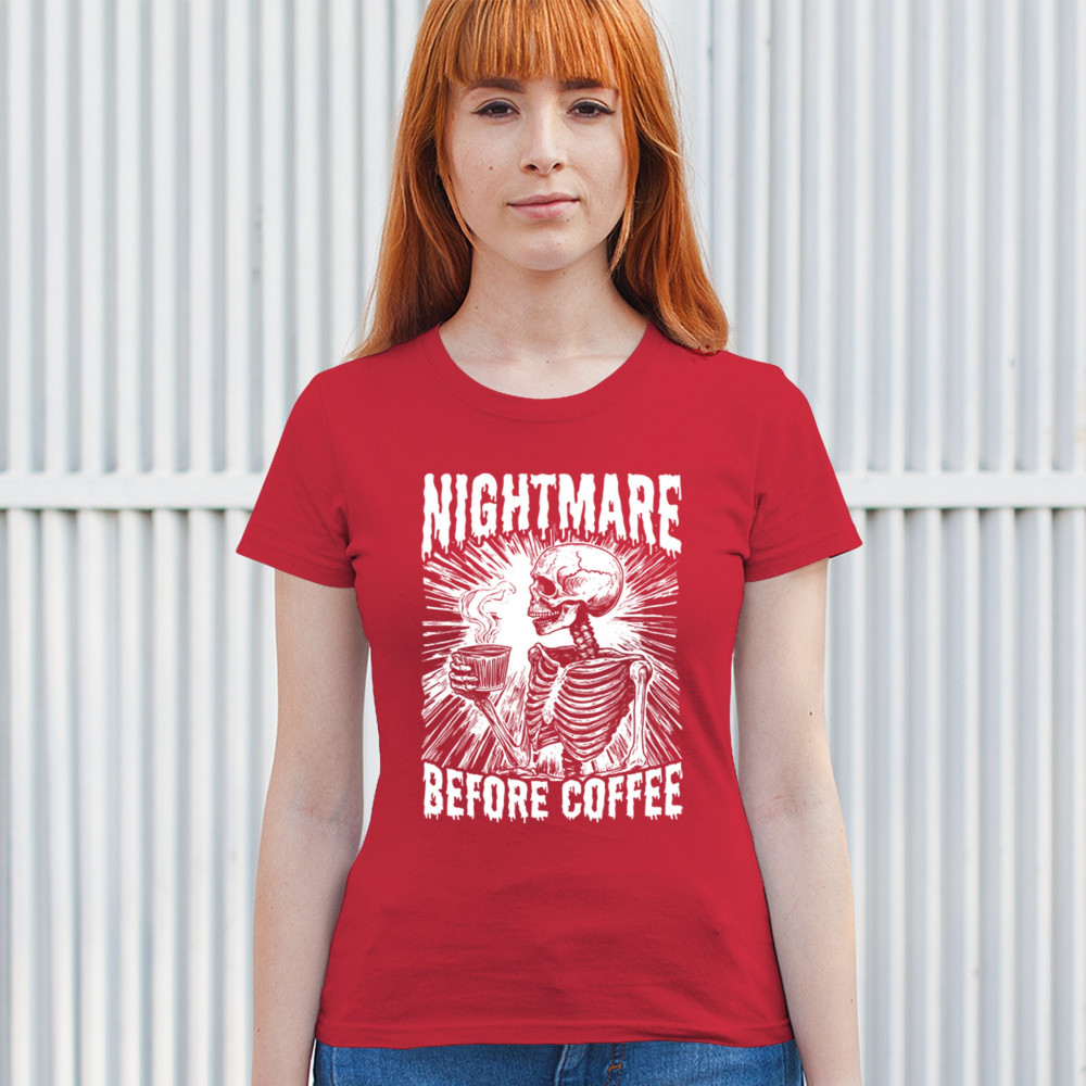 Show off your love for coffee with this quirky "Nightmare Before Coffee" skeleton design, blending humor and gothic style for caffeine lovers.