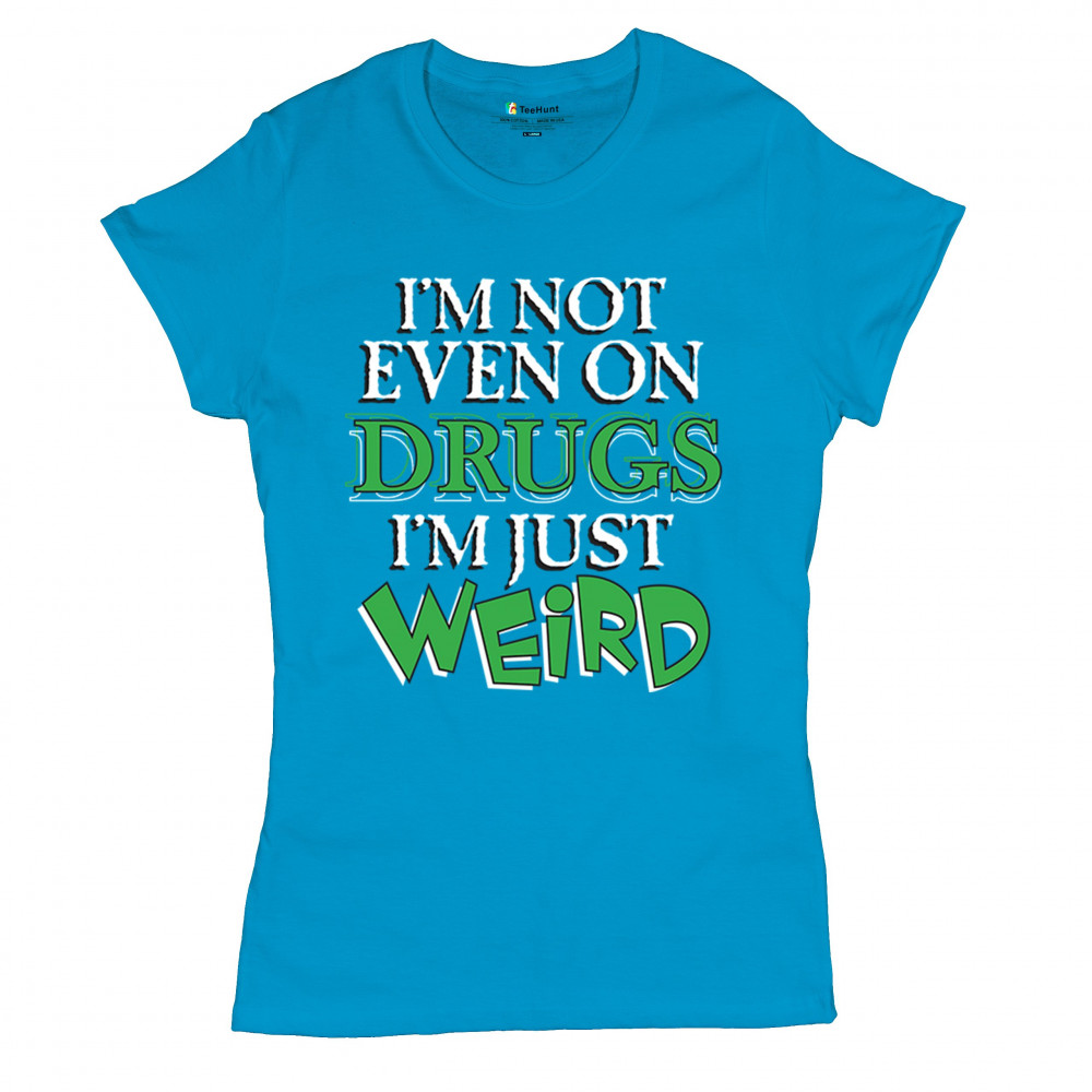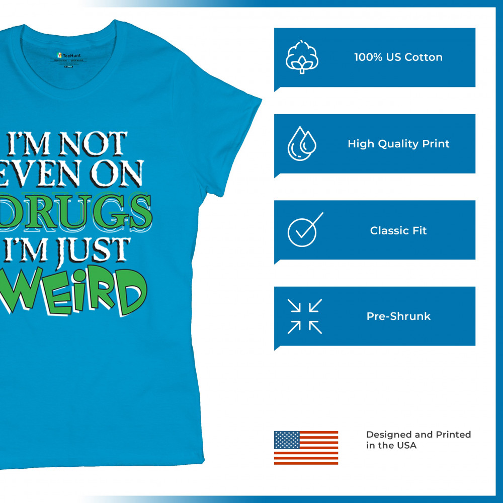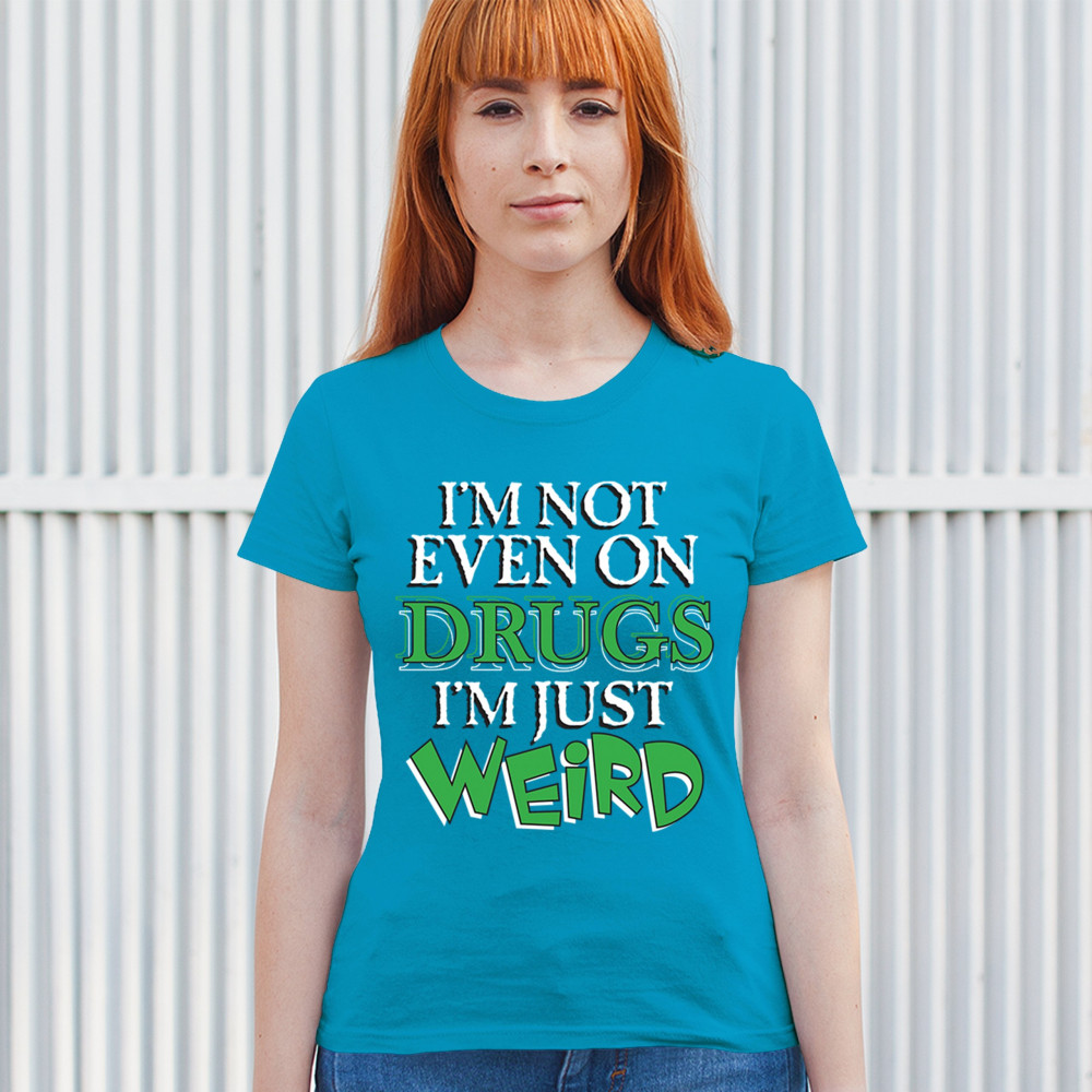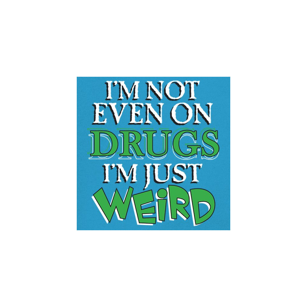 Bold weird design for introverts and quirky minds. Says “I'm not even on drugs I'm just weirdâ€â€”perfect for awkward humor and loud energy.
