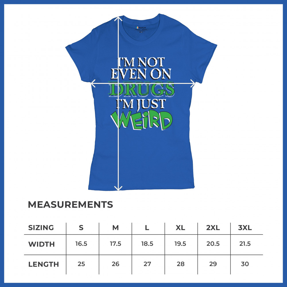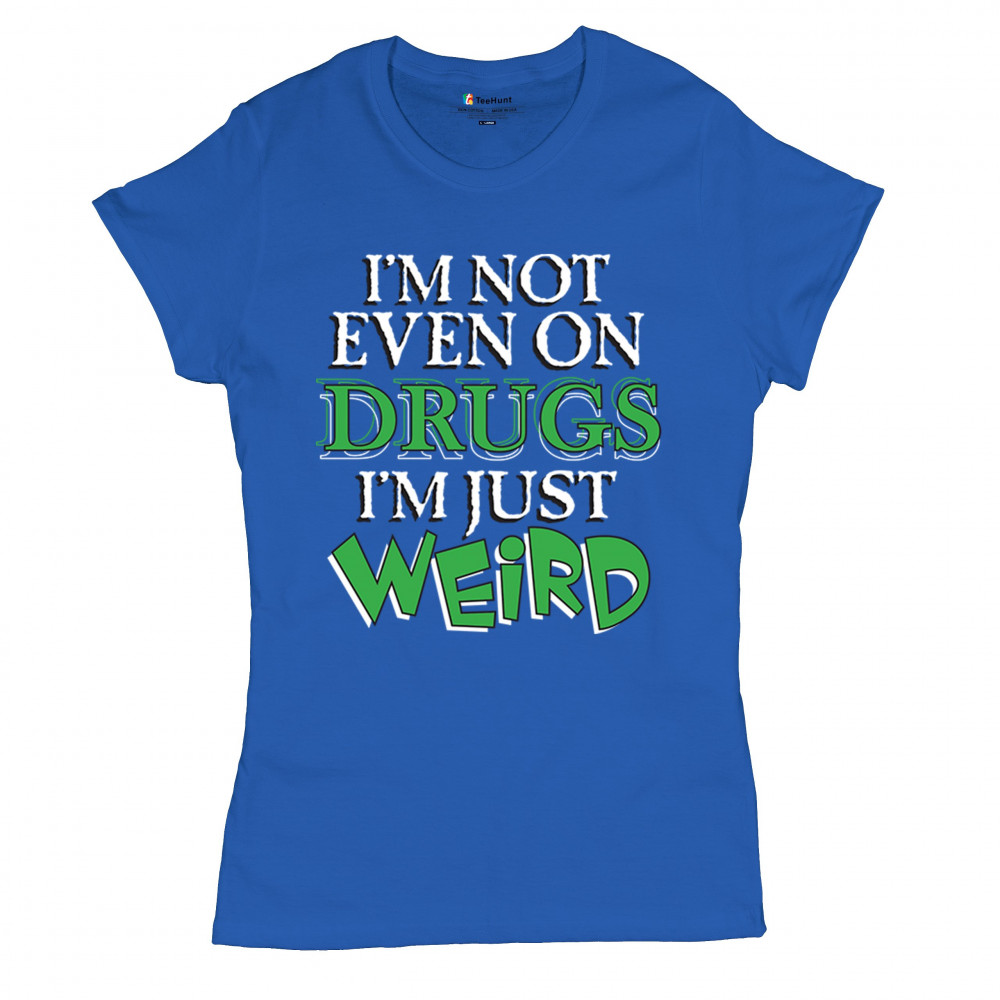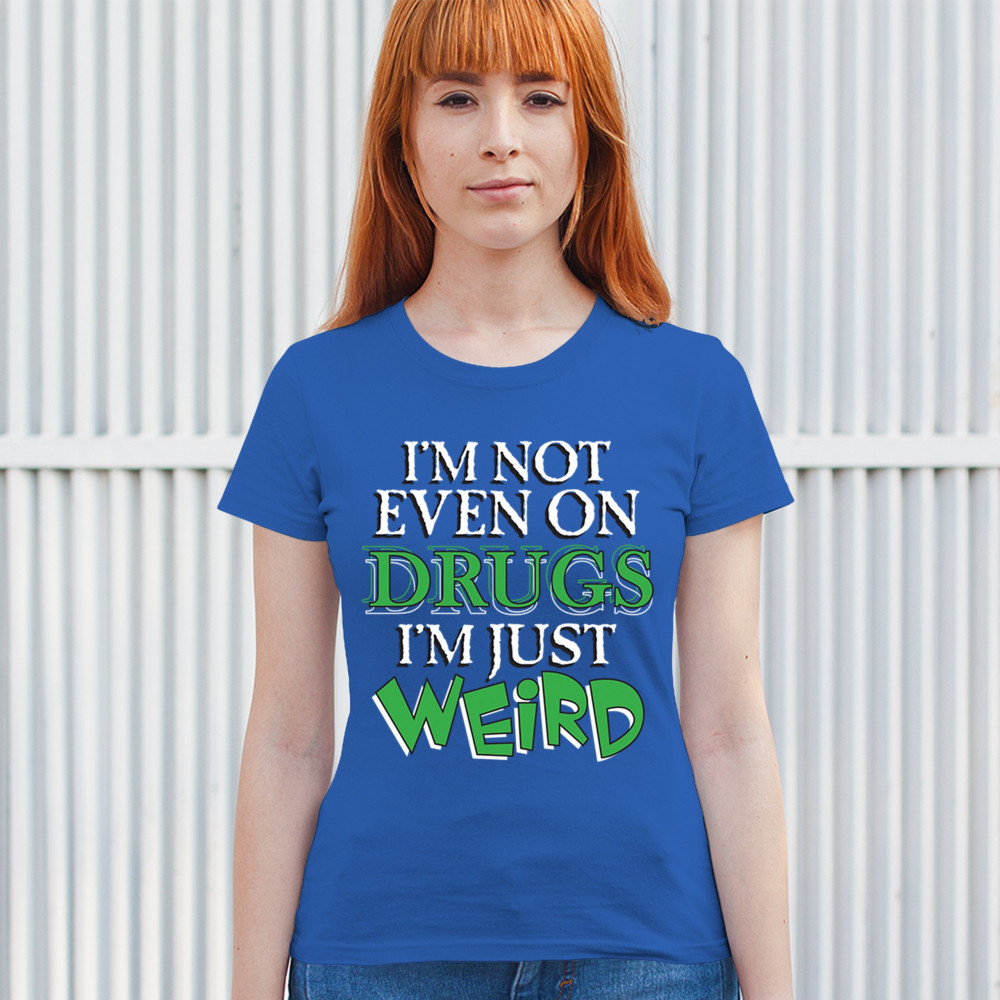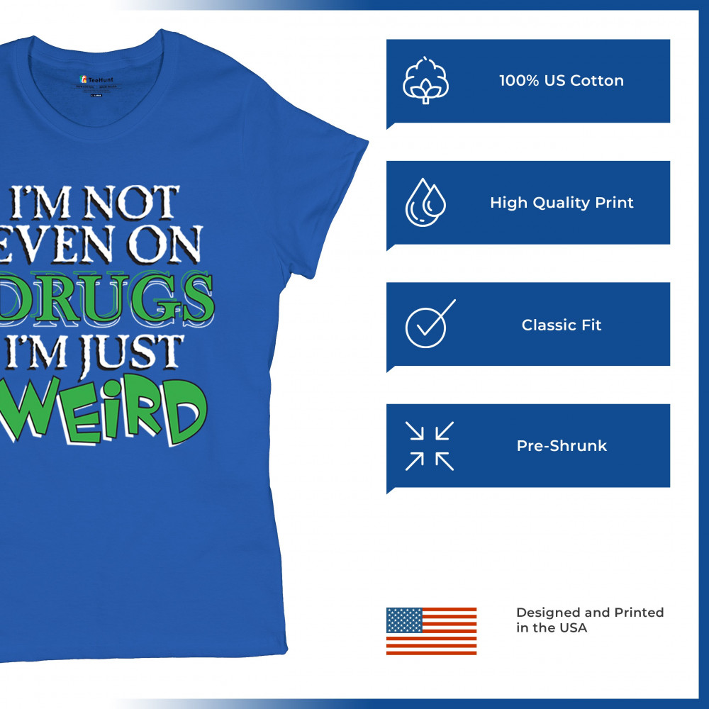 Bold weird design for introverts and quirky minds. Says “I'm not even on drugs I'm just weirdâ€â€”perfect for awkward humor and loud energy.