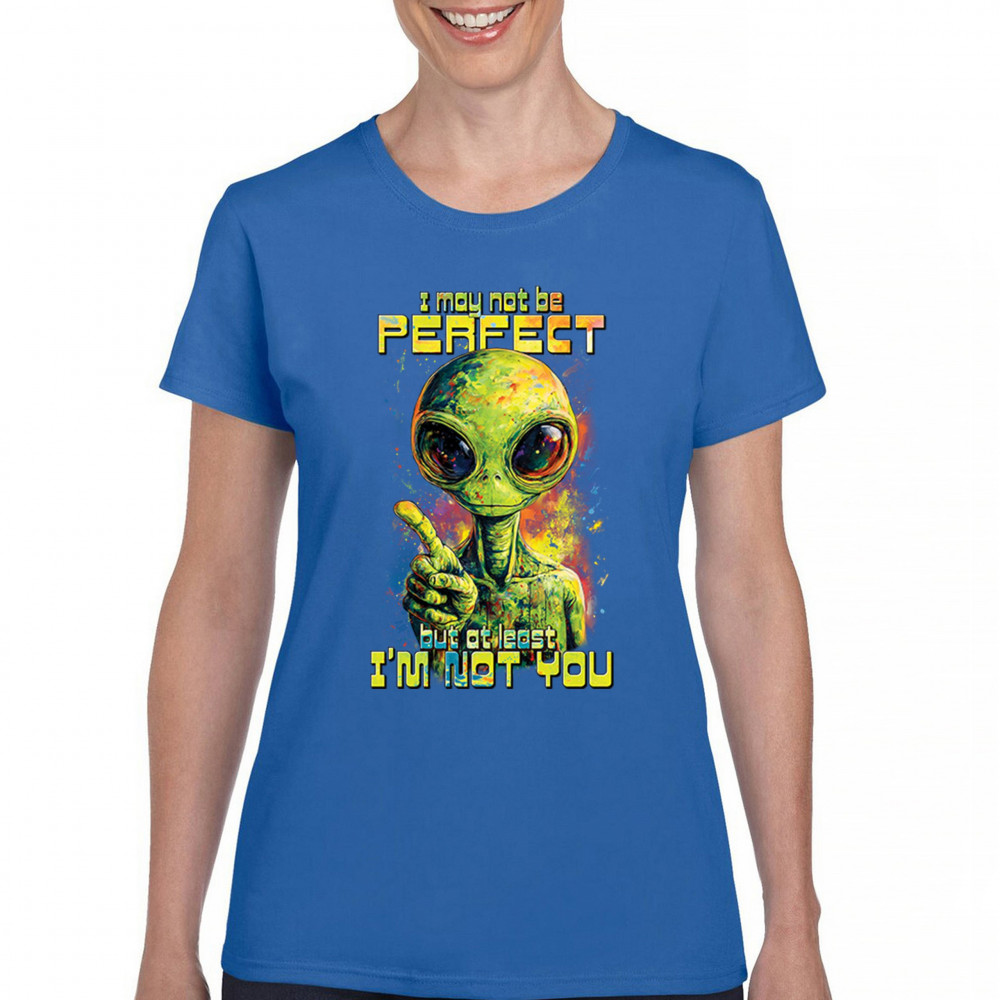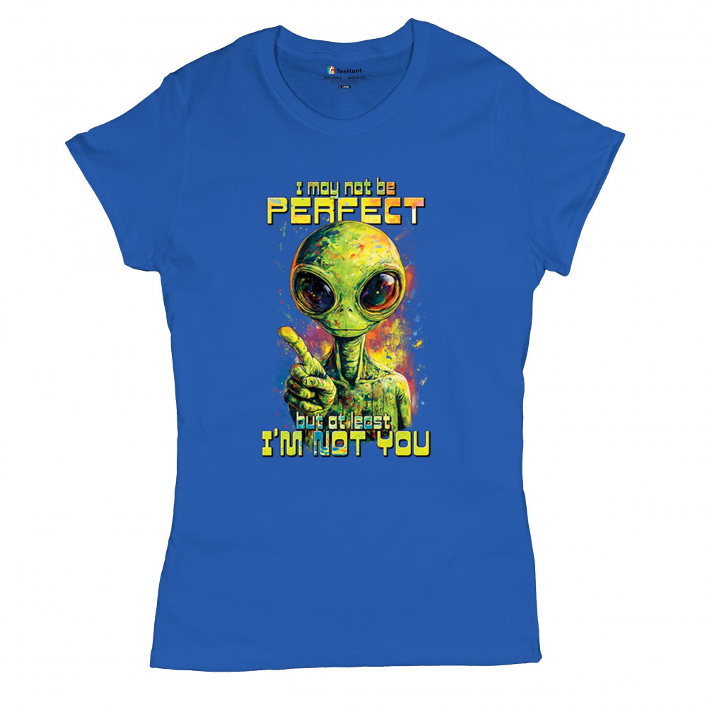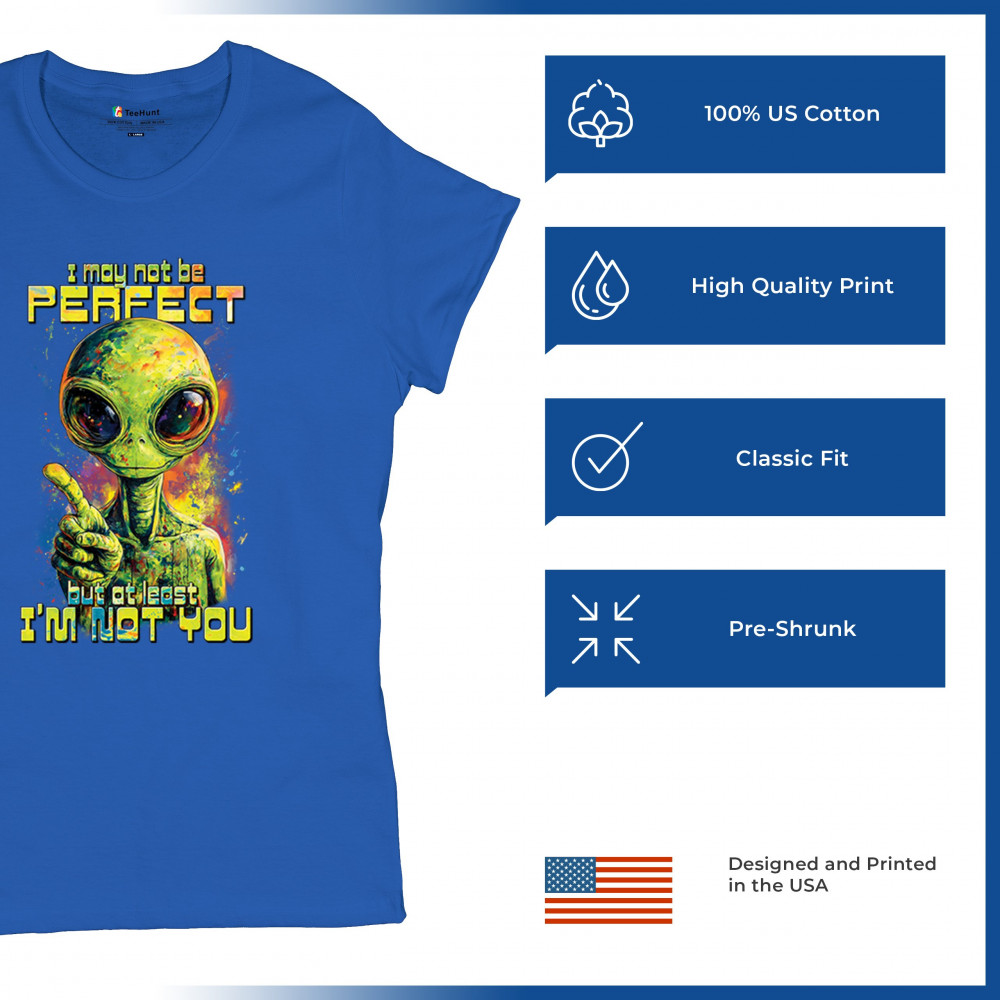 This smug alien design delivers sharp sarcastic humor with vibrant cosmic flair. Featuring a big-eyed extraterrestrial and the quote “I may not be perfect, but at least I’m not you,†it’s perfect for sci-fi fans, alien lovers, jokesters, and oddballs alike. A bold, funny statement for parties, UFO events, and festivals.