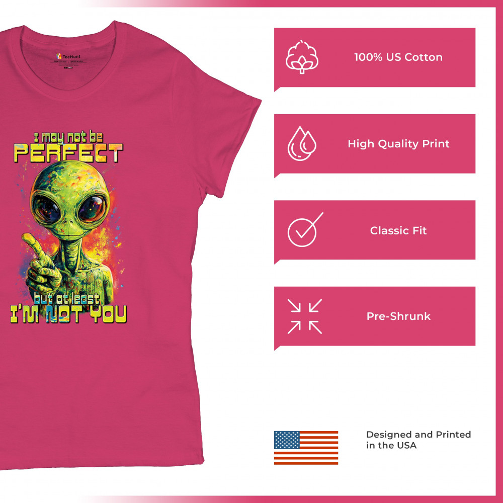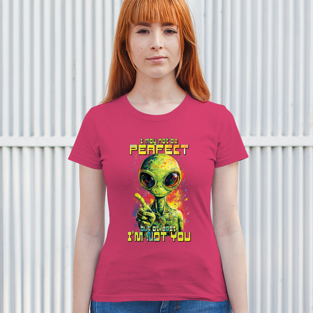 This smug alien design delivers sharp sarcastic humor with vibrant cosmic flair. Featuring a big-eyed extraterrestrial and the quote “I may not be perfect, but at least I’m not you,†it’s perfect for sci-fi fans, alien lovers, jokesters, and oddballs alike. A bold, funny statement for parties, UFO events, and festivals.