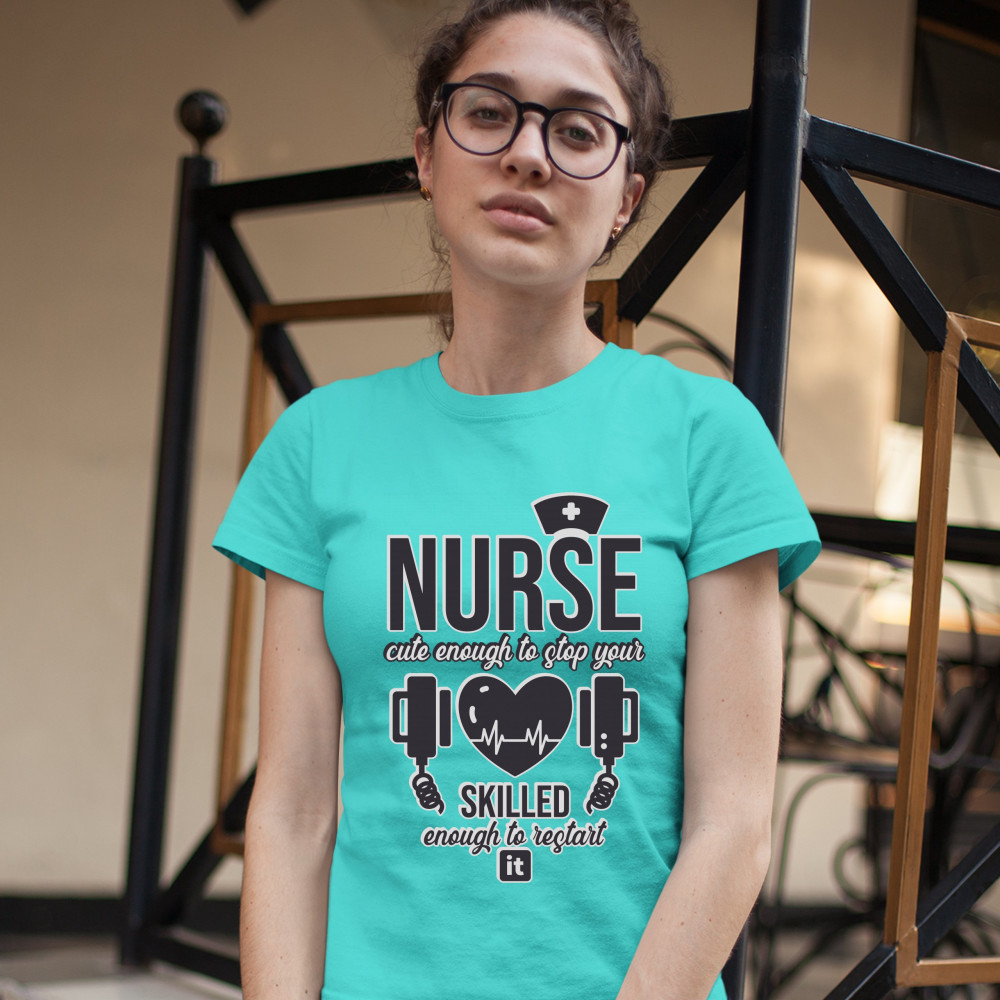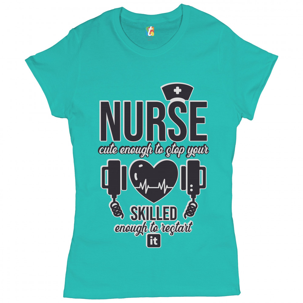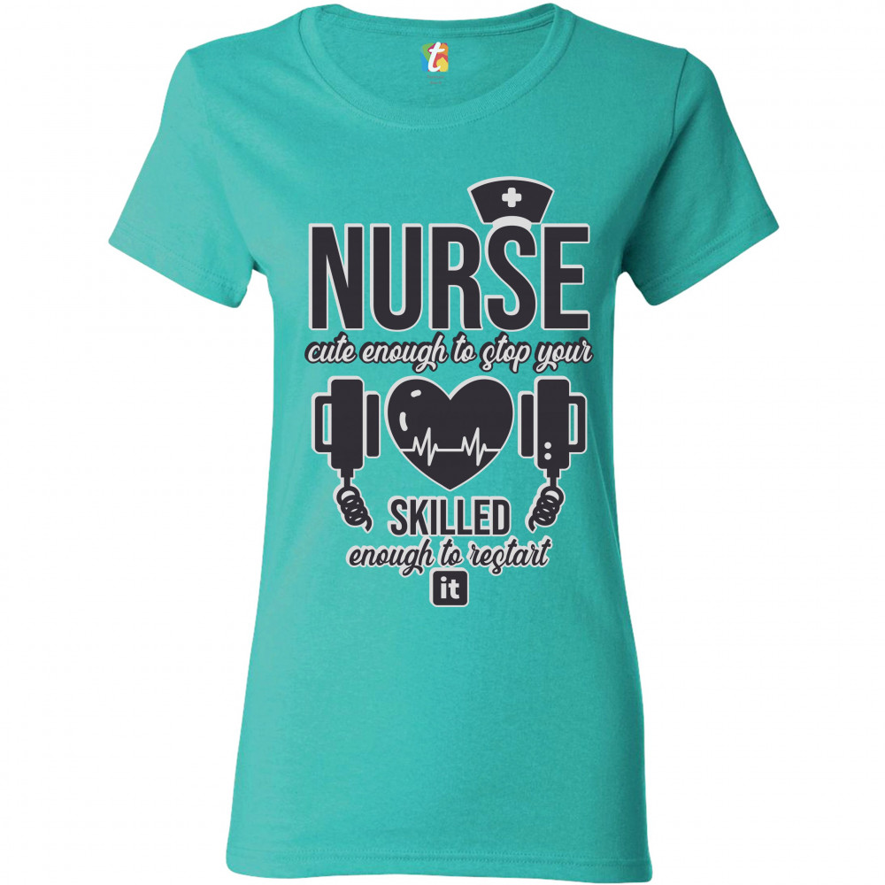 NURSE CUTE ENOUGH TO STOP YOUR HEART t-shirt ems cpr first aid women's tee light blue