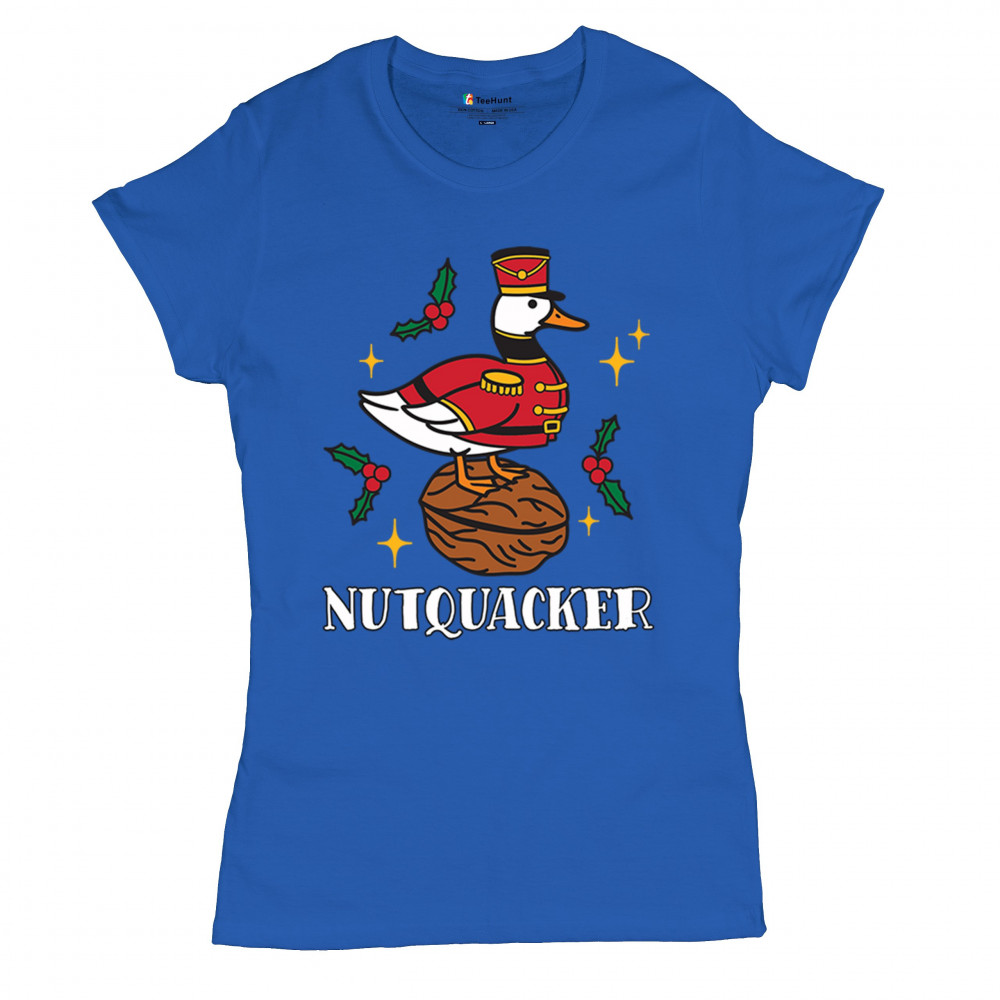 This hilarious Nutquacker design puts a festive spin on holiday humor, showcasing a duck dressed as a nutcracker standing on a walnut with holly accents and bright Christmas touches. A perfect choice for quirky gift-givers, holiday party outfits, and anyone who loves clever Christmas graphics that add personality, charm, and seasonal fun to their celebrations.