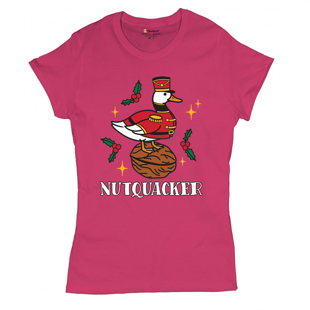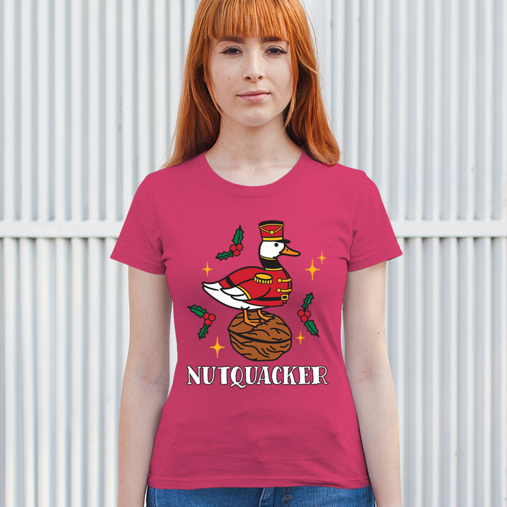 This hilarious Nutquacker design puts a festive spin on holiday humor, showcasing a duck dressed as a nutcracker standing on a walnut with holly accents and bright Christmas touches. A perfect choice for quirky gift-givers, holiday party outfits, and anyone who loves clever Christmas graphics that add personality, charm, and seasonal fun to their celebrations.