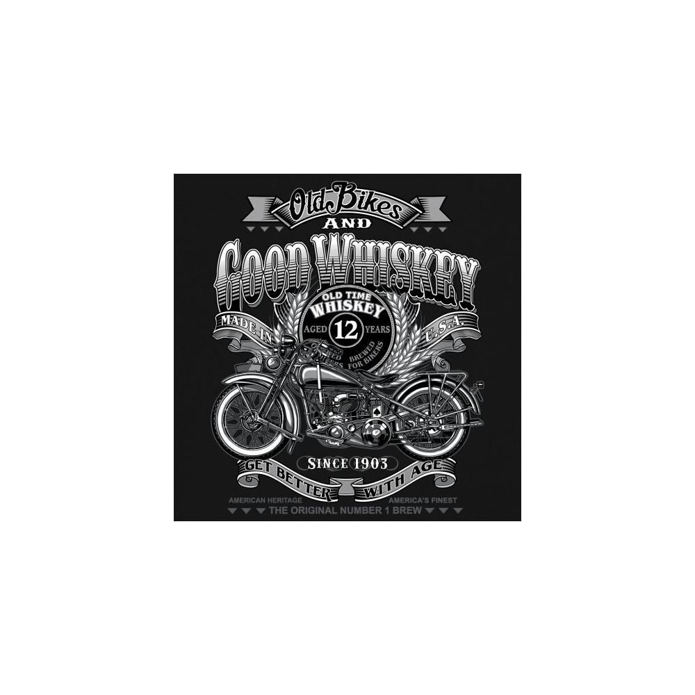 Vintage design with old bike, 12-year whiskey label, and 1903 tribute—perfect for bikers who ride hard and sip slow.
