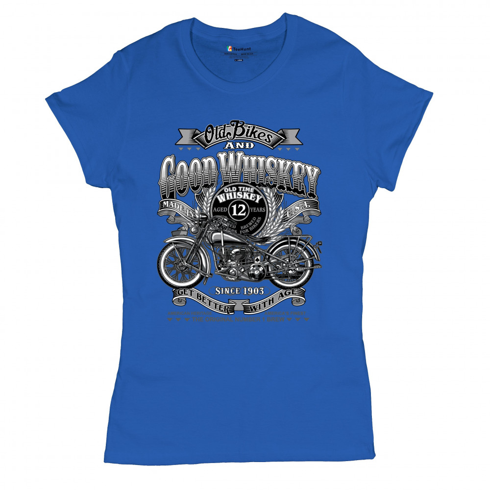 Vintage design with old bike, 12-year whiskey label, and 1903 tribute—perfect for bikers who ride hard and sip slow.