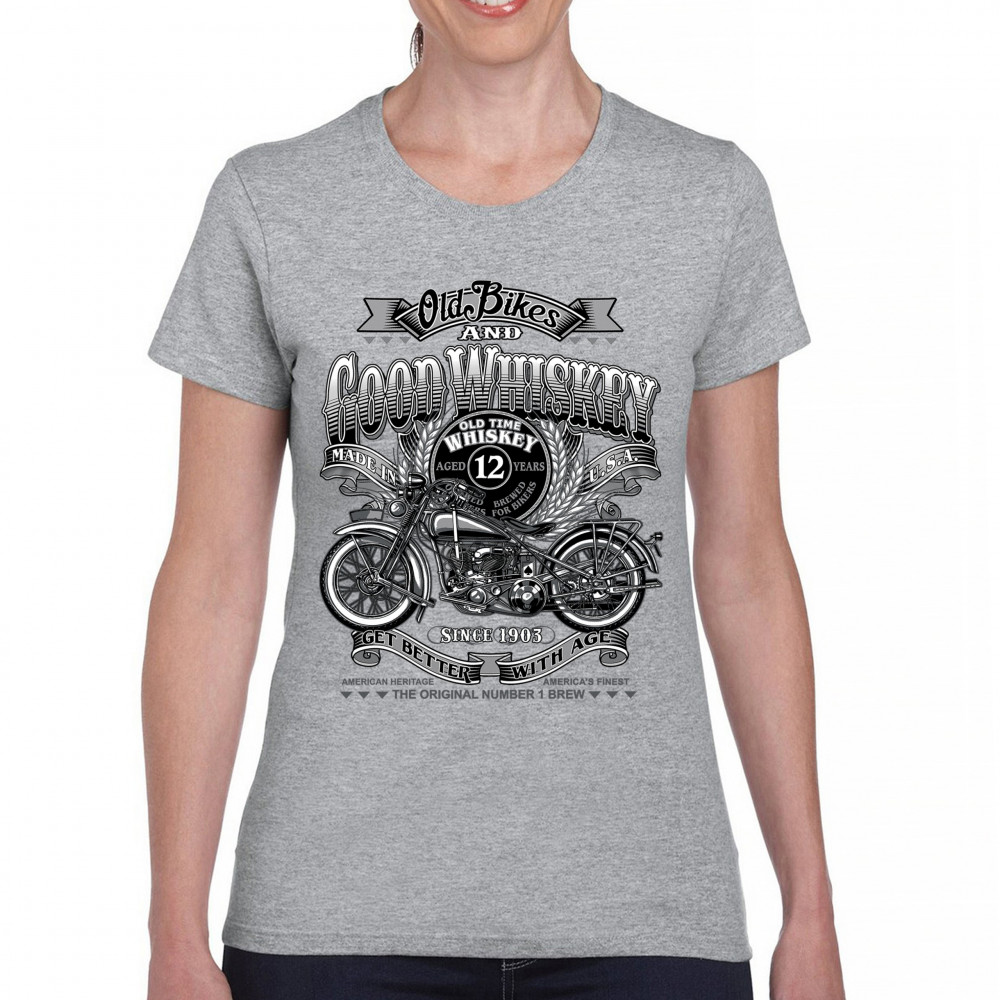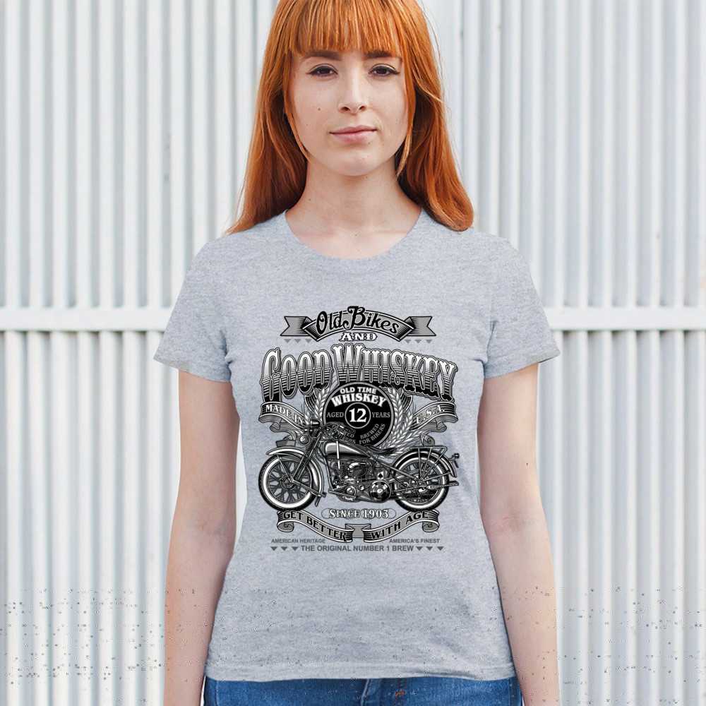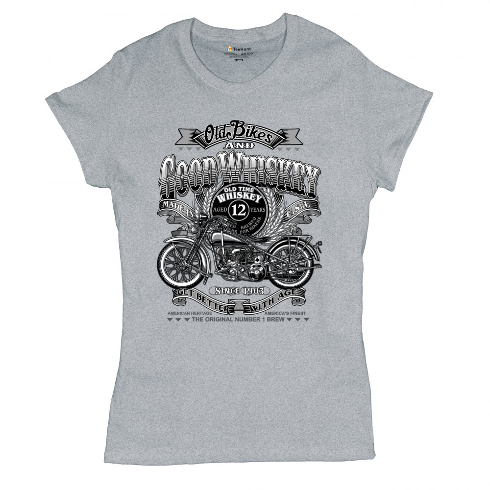Vintage design with old bike, 12-year whiskey label, and 1903 tribute—perfect for bikers who ride hard and sip slow.
