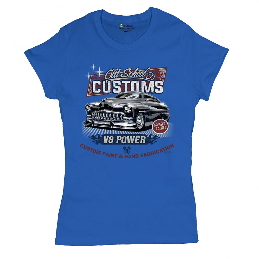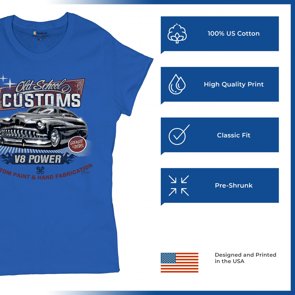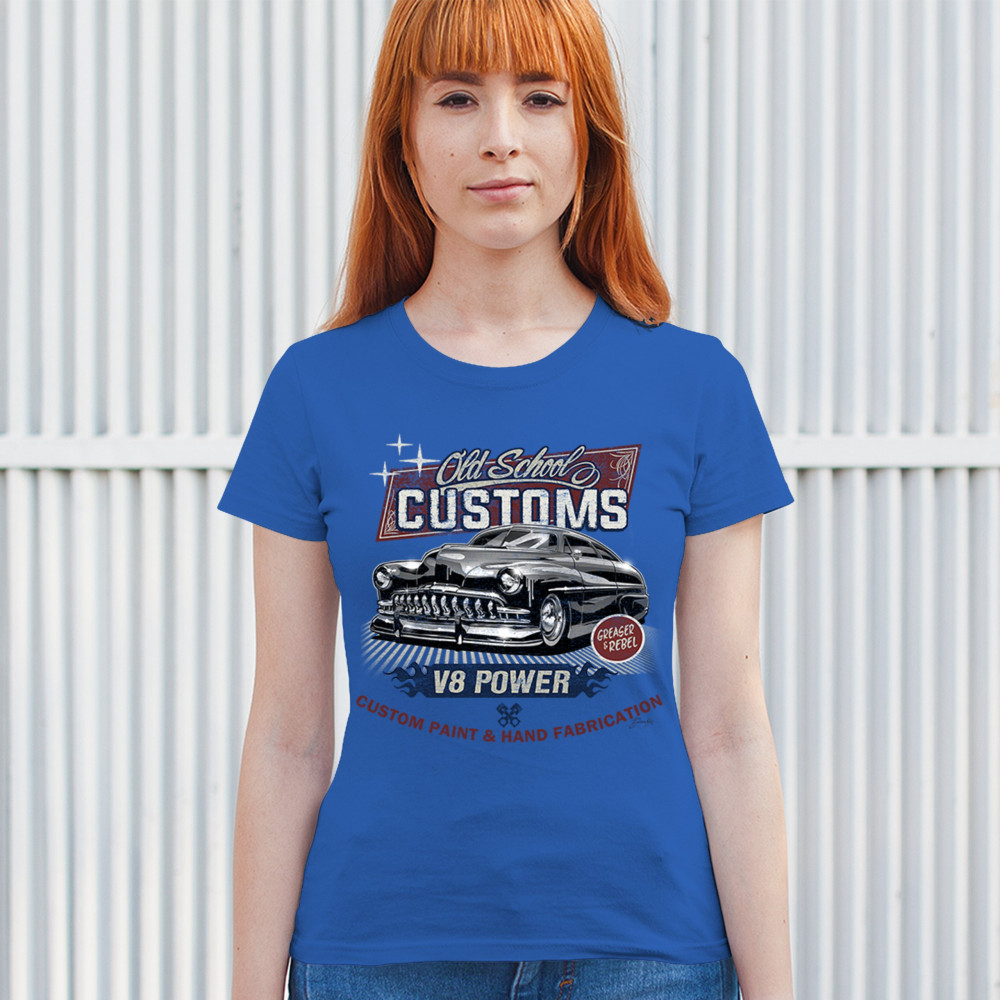 Celebrate classic automotive culture with our "Old School Customs" t-shirt, featuring a V8 power design. Perfect for car enthusiasts and fans of vintage rides.