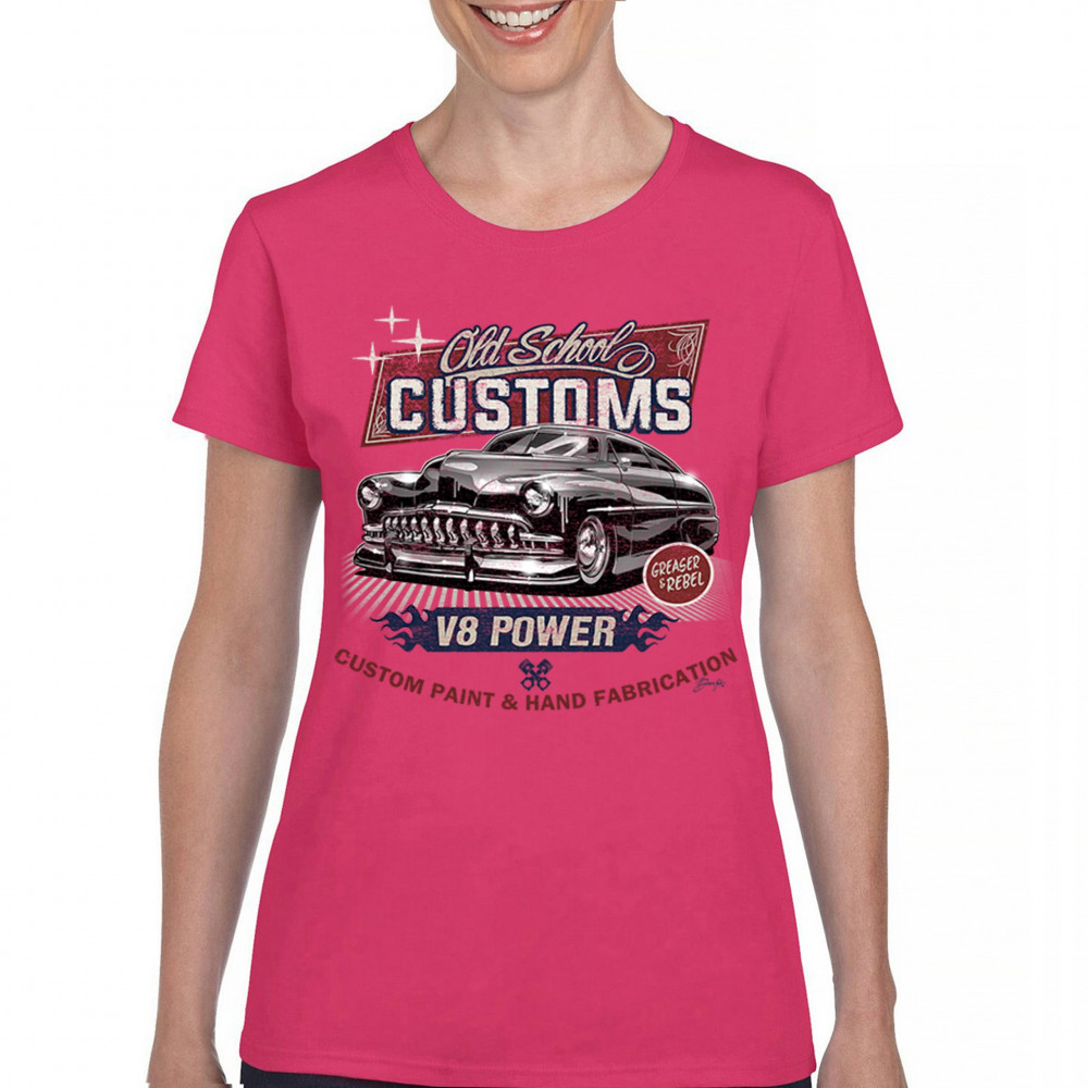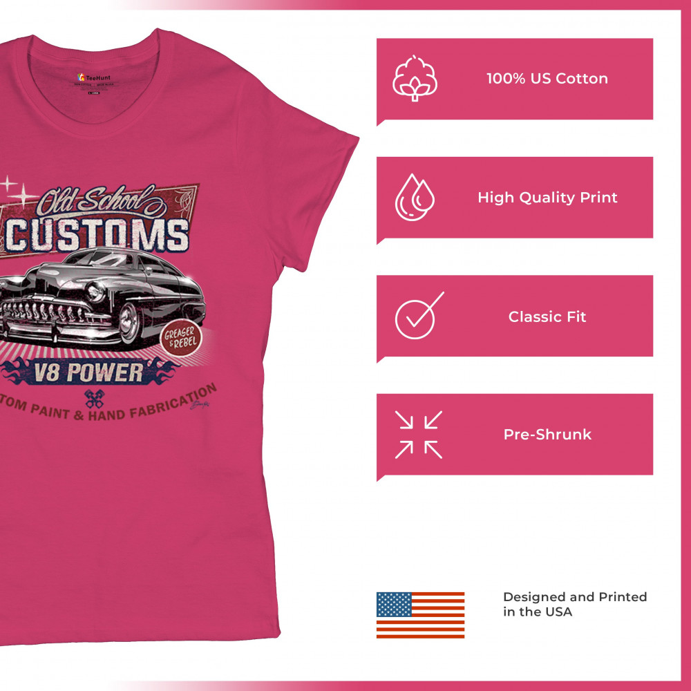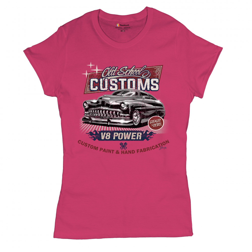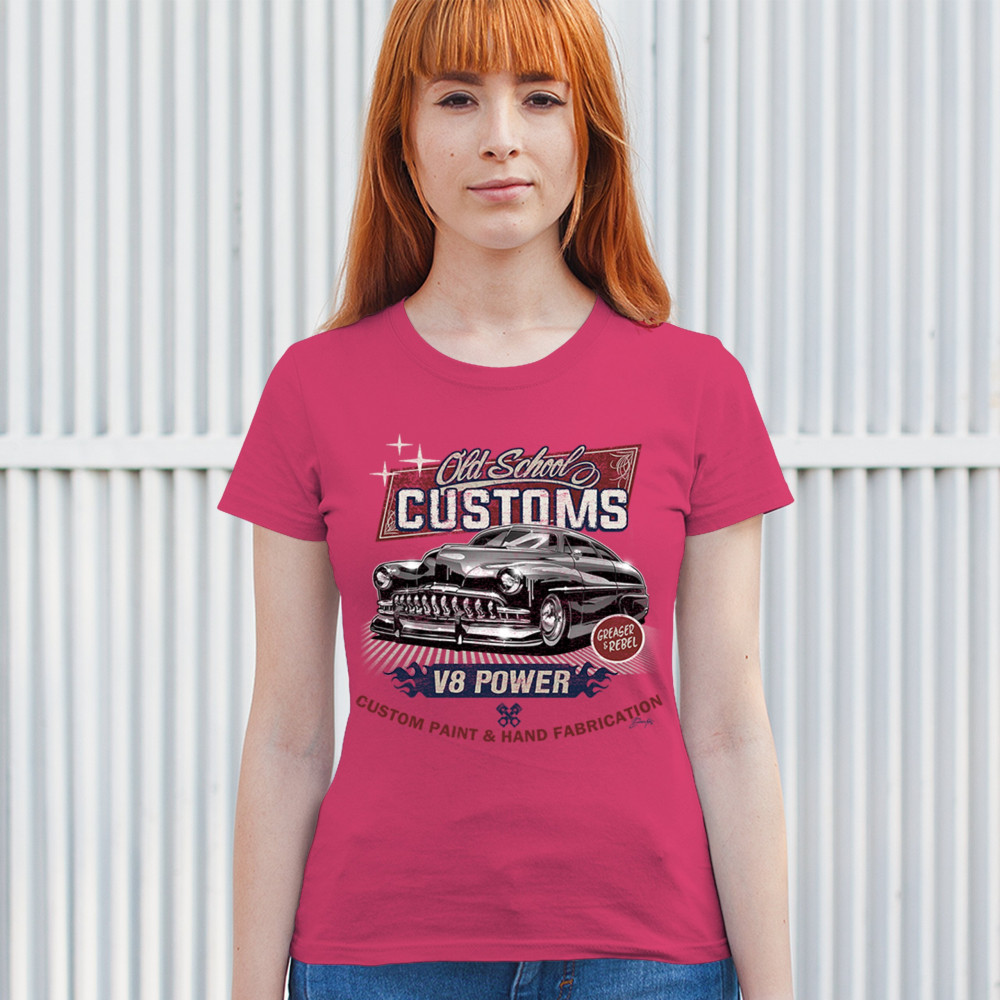 Celebrate classic automotive culture with our "Old School Customs" t-shirt, featuring a V8 power design. Perfect for car enthusiasts and fans of vintage rides.