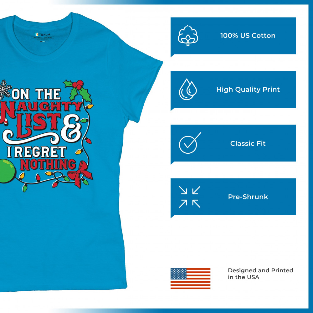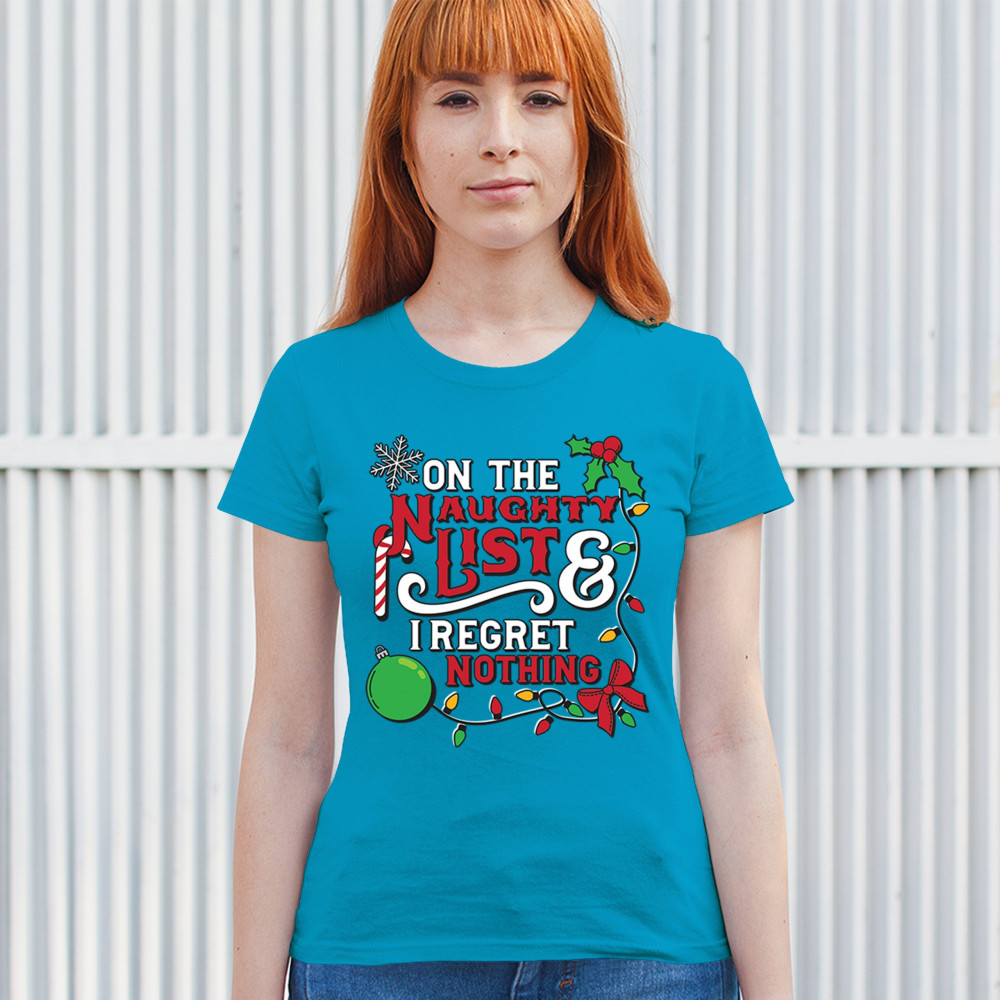 Express your holiday spirit with humor through the "Naughty List & I Regret Nothing" design, a perfect companion for Christmas celebrations, gift exchanges, or festive family gatherings. It adds a touch of playfulness to your winter wardrobe while spreading joy and laughter. Ideal for pairing with an ugly sweater or cozy holiday apparel, it’s the ultimate way to stay jolly and carefree throughout the season.