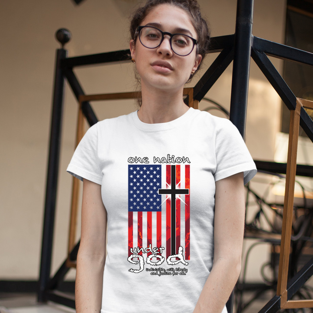 A patriotic print saying "One Nation Under God Indivisible, with Liberty and Justice for All" and featuring an American Flag with a cross instead of one of the stripes. Great choice for a religious person to wear on Independence Day or any other patriotic
