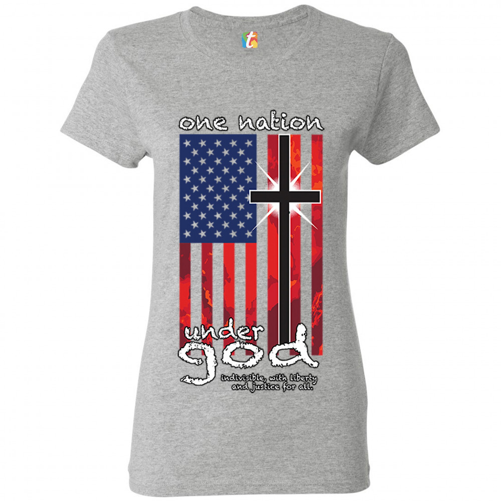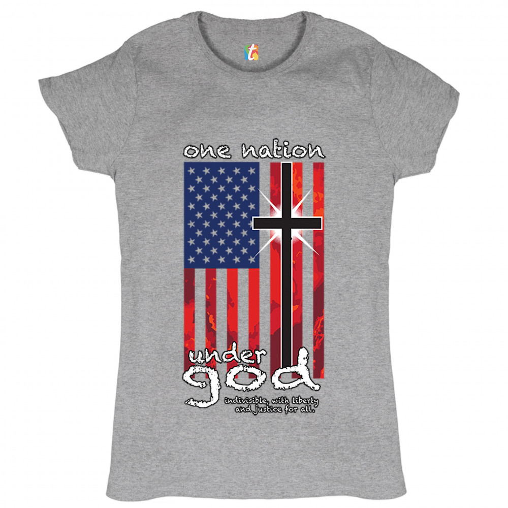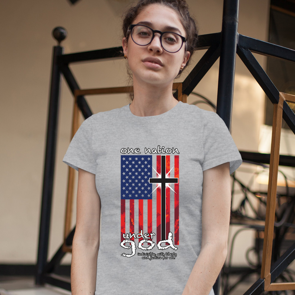 A patriotic print saying "One Nation Under God Indivisible, with Liberty and Justice for All" and featuring an American Flag with a cross instead of one of the stripes. Great choice for a religious person to wear on Independence Day or any other patriotic