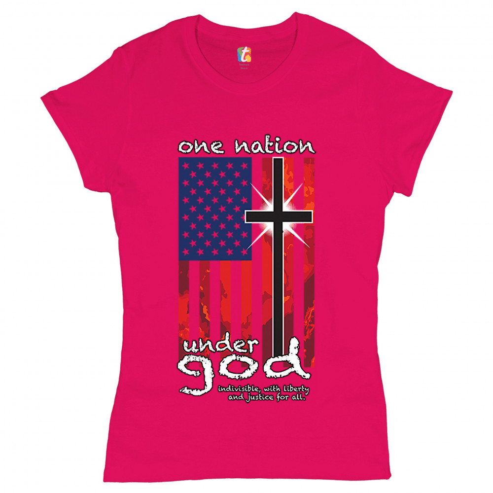 A patriotic print saying "One Nation Under God Indivisible, with Liberty and Justice for All" and featuring an American Flag with a cross instead of one of the stripes. Great choice for a religious person to wear on Independence Day or any other patriotic