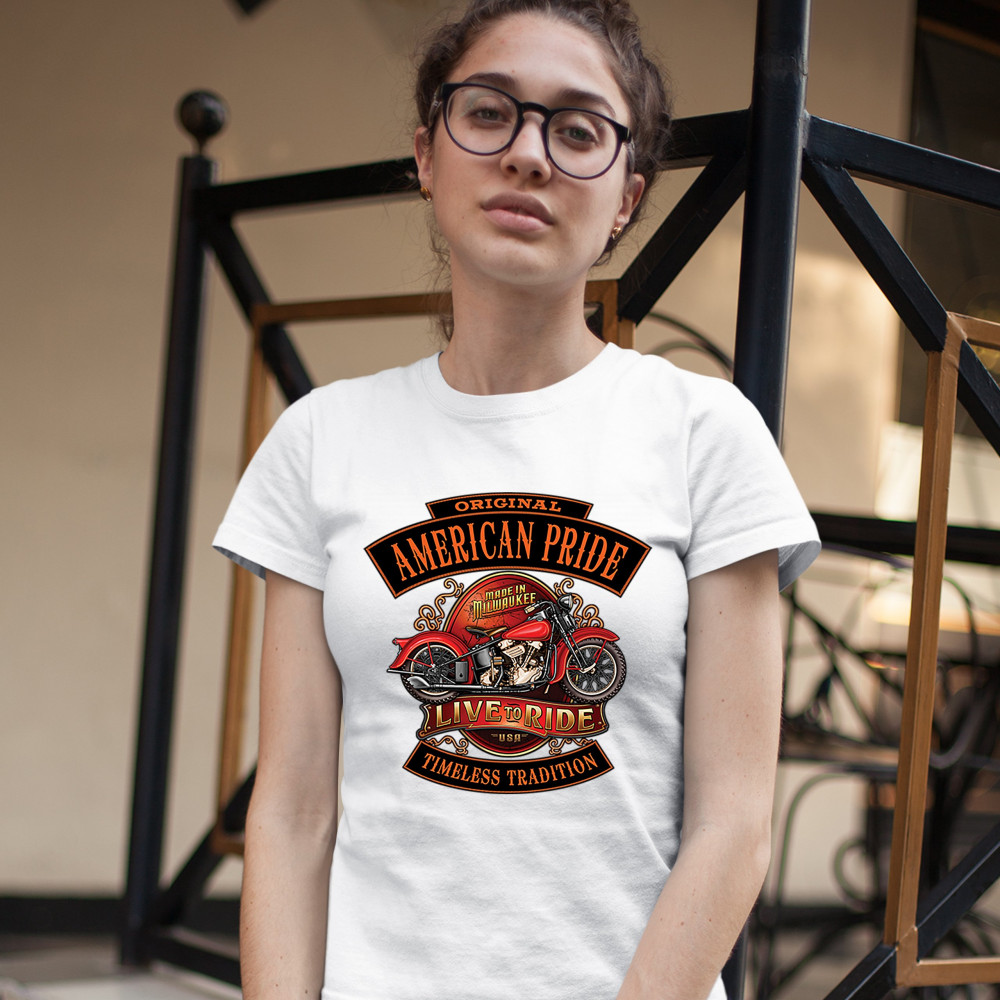 ORIGINAL AMERICAN PRIDE t-shirt live to ride timeless tradition women's tee white