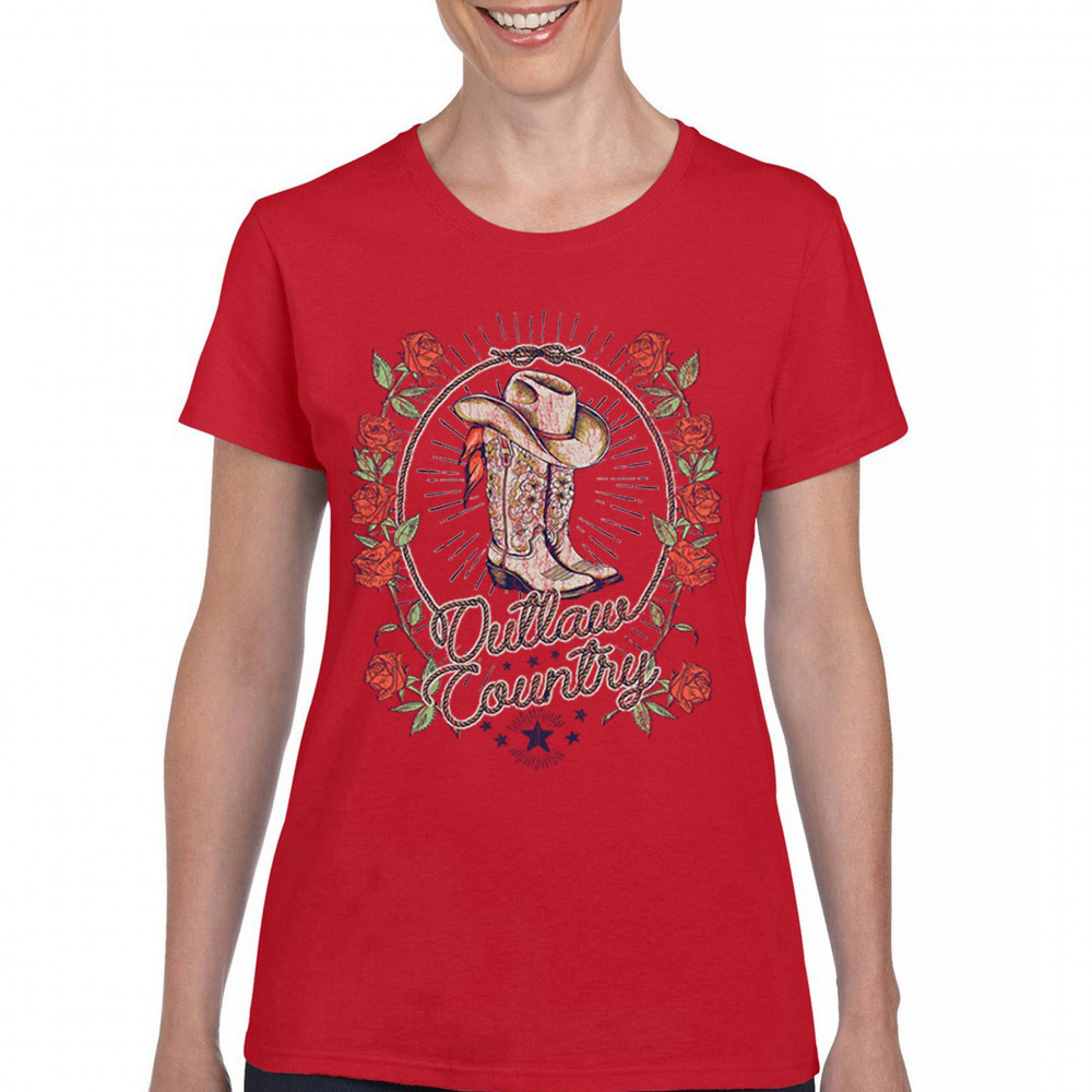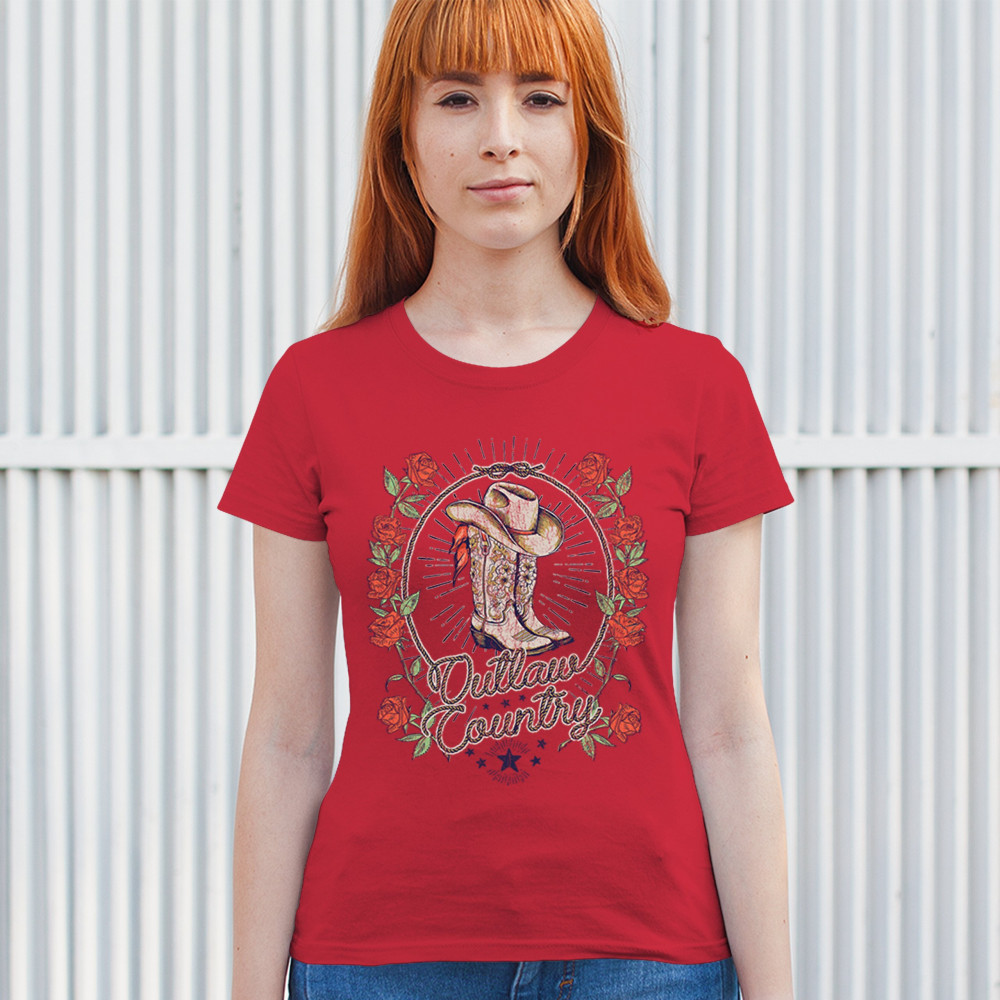 Outlaw country design with cowgirl boots, hat, and roses. Bold feminine western style for concerts, rodeos, and southern lifestyle lovers.