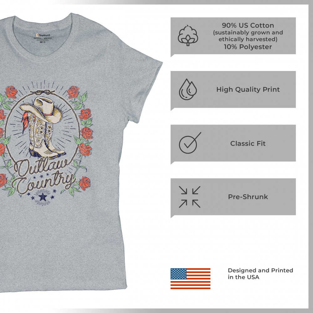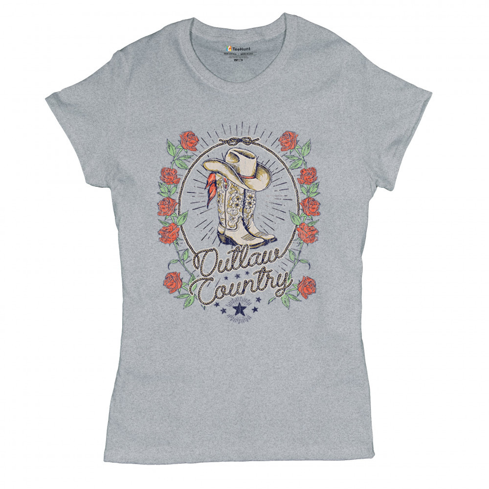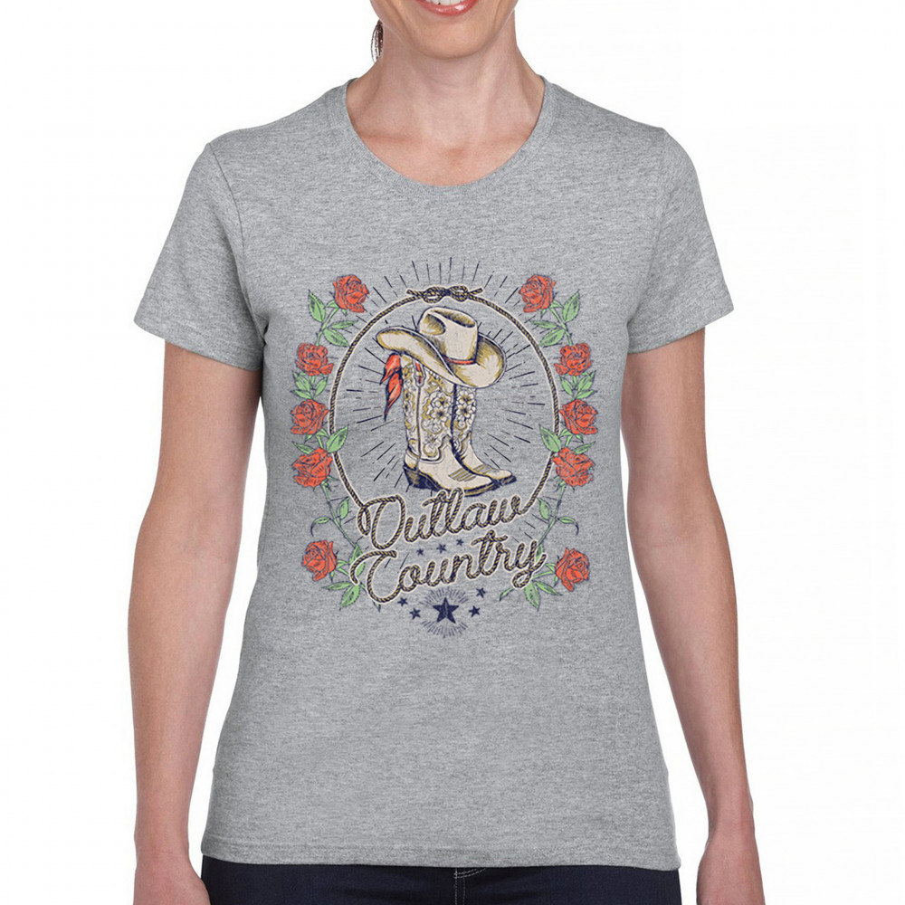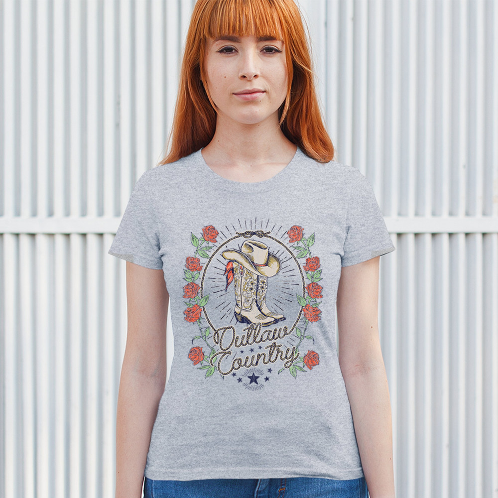 Outlaw country design with cowgirl boots, hat, and roses. Bold feminine western style for concerts, rodeos, and southern lifestyle lovers.