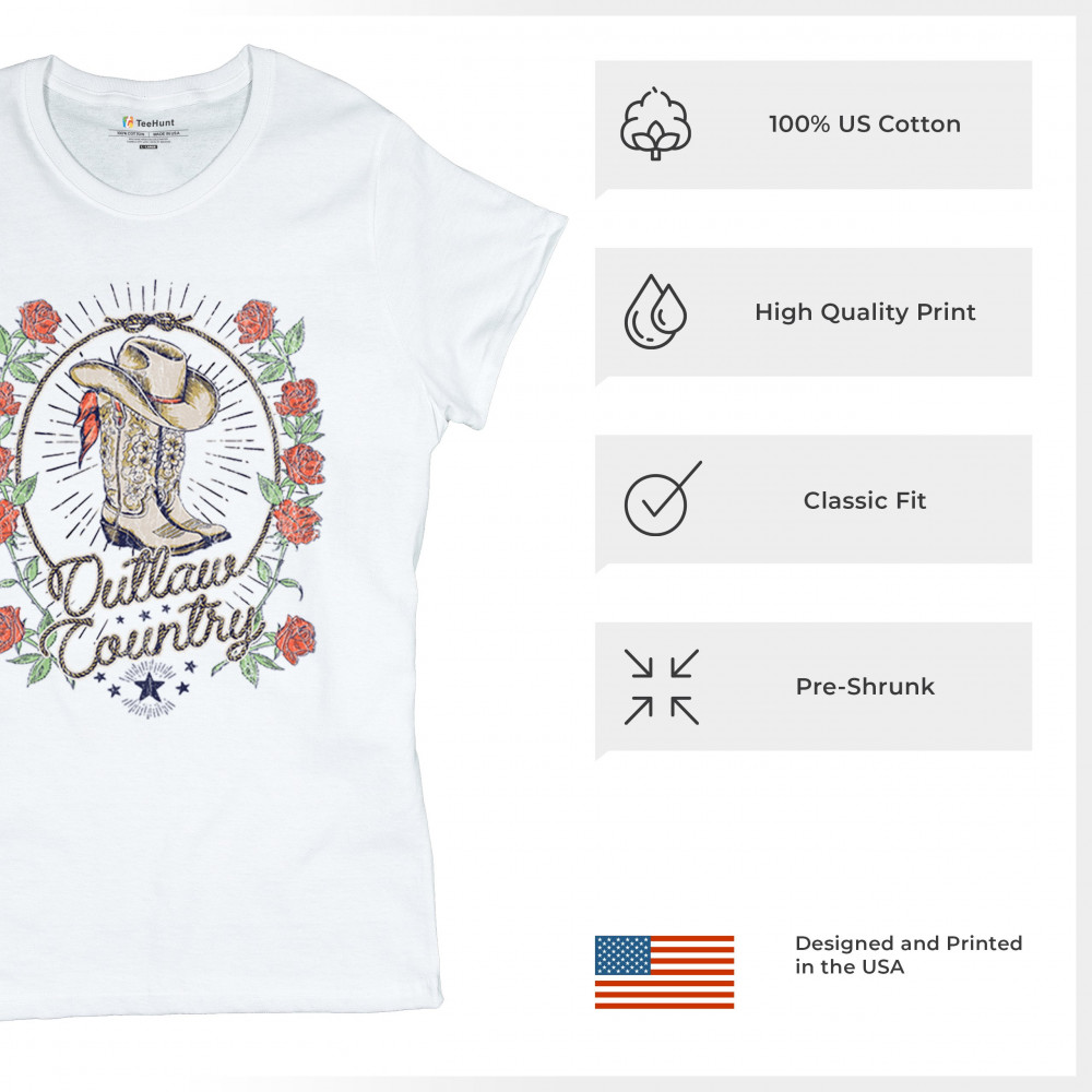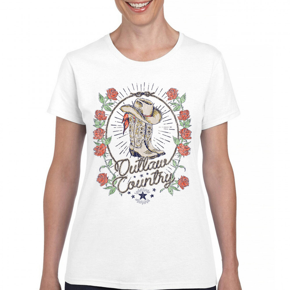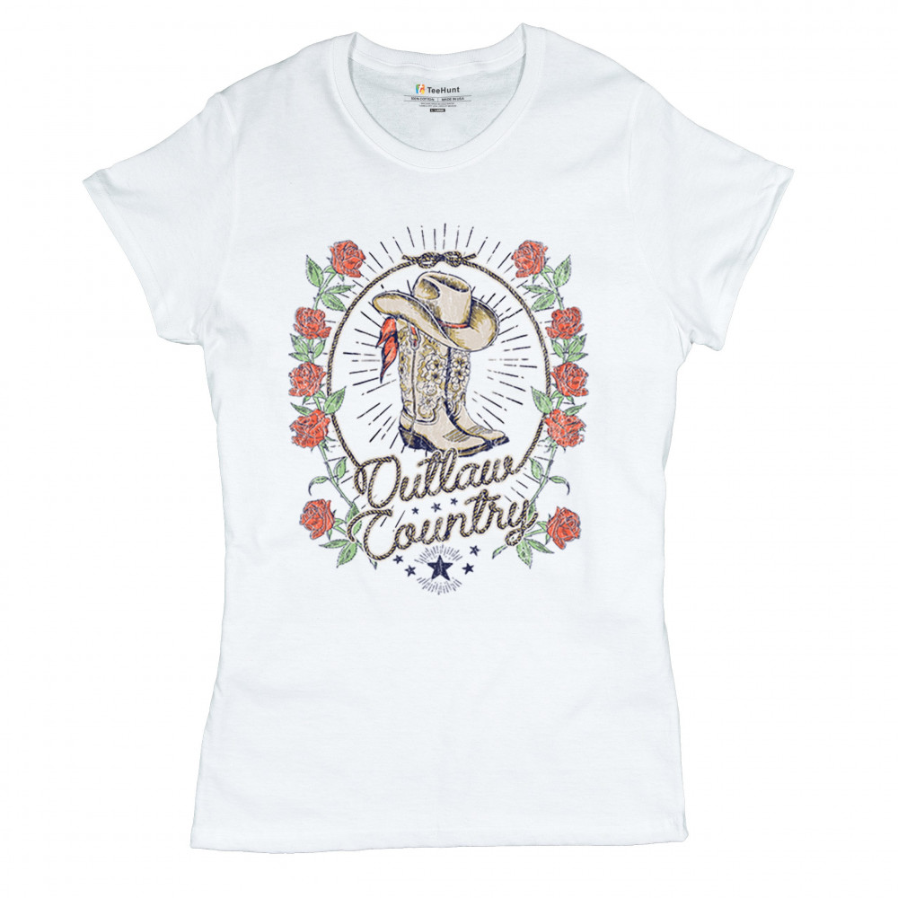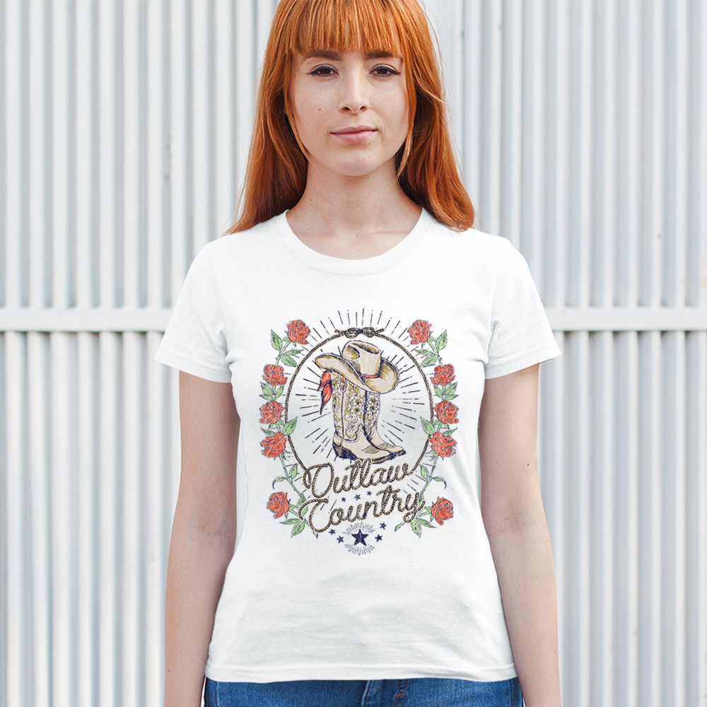 Outlaw country design with cowgirl boots, hat, and roses. Bold feminine western style for concerts, rodeos, and southern lifestyle lovers.
