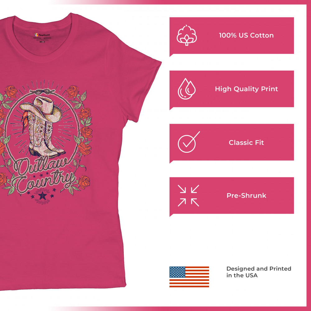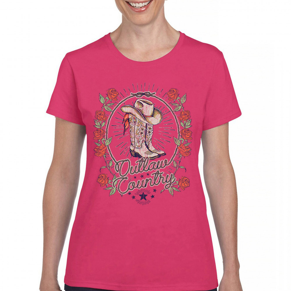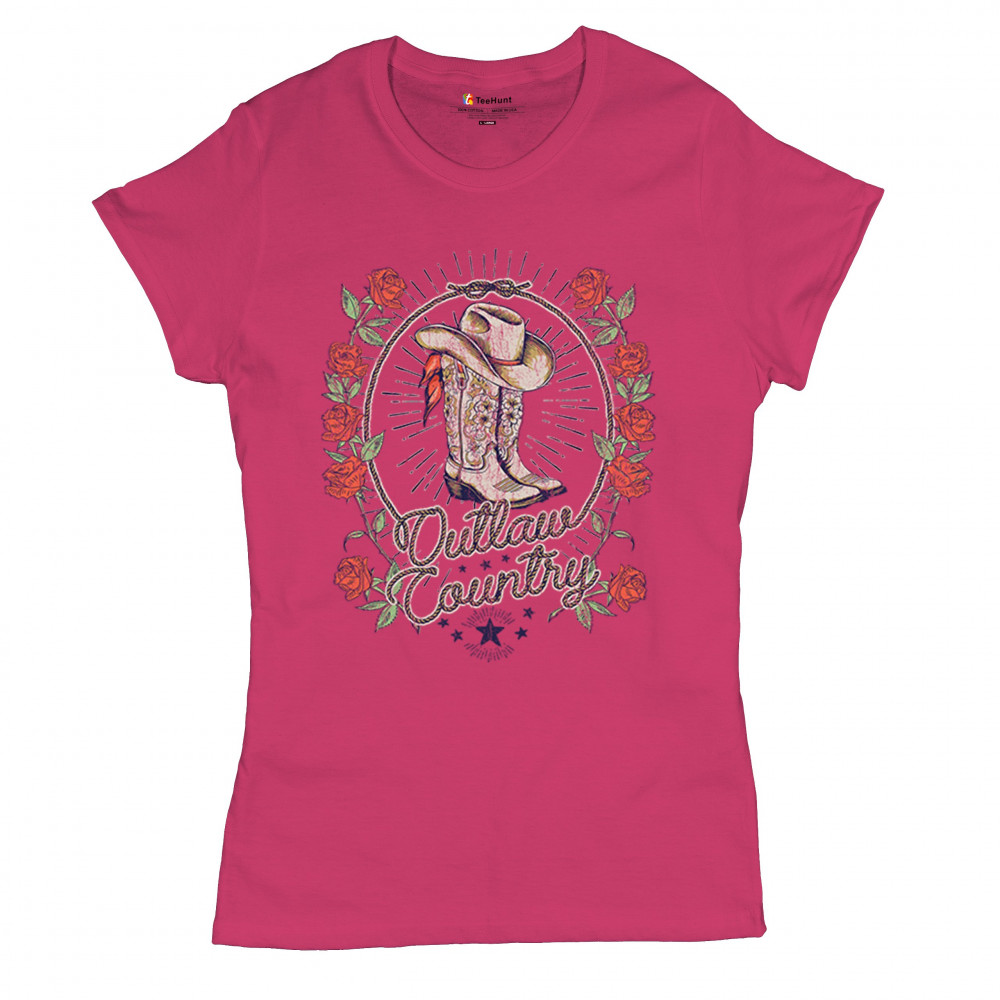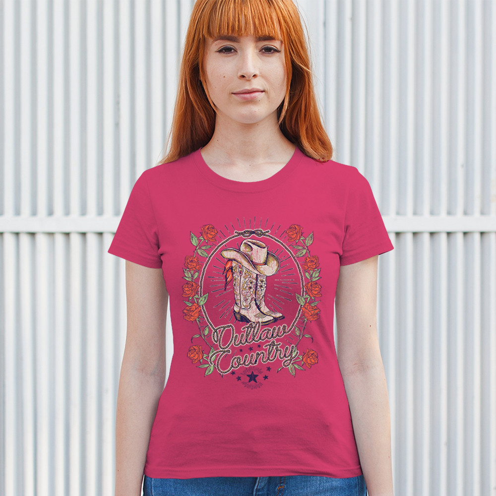 Outlaw country design with cowgirl boots, hat, and roses. Bold feminine western style for concerts, rodeos, and southern lifestyle lovers.