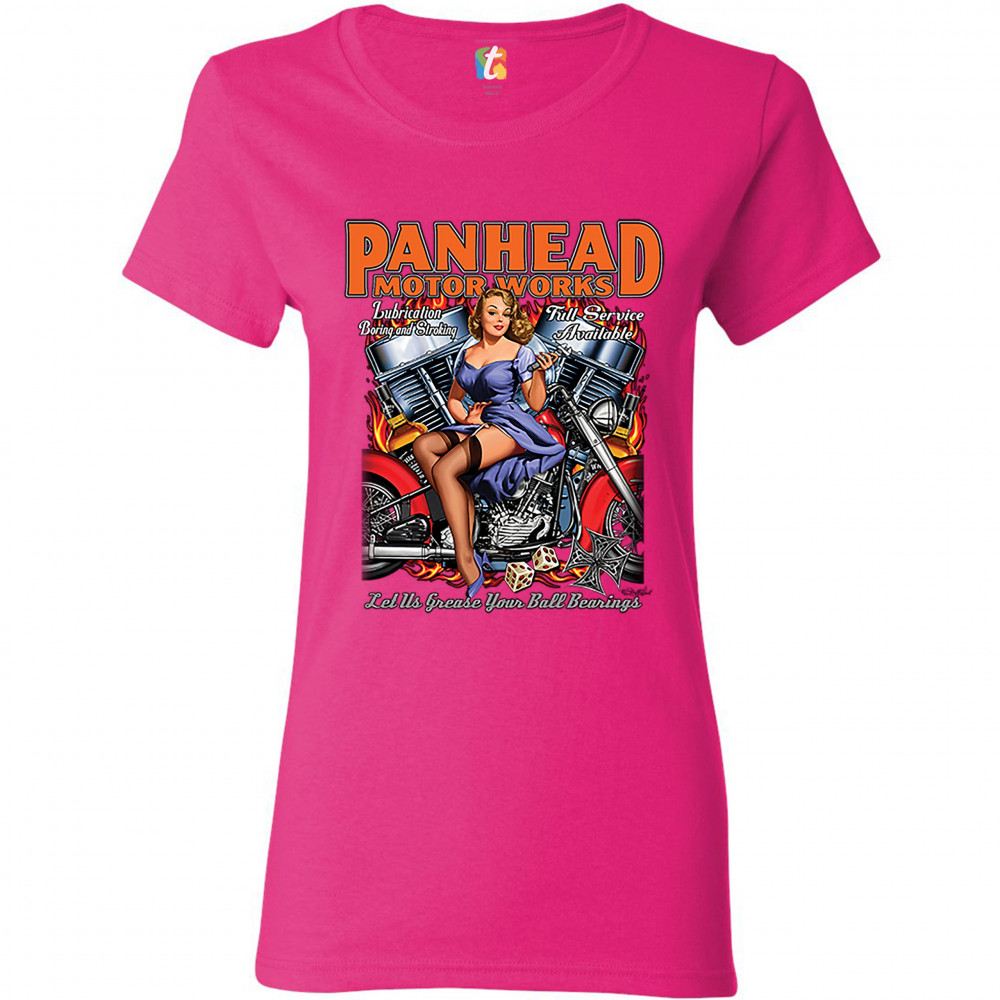 A print featuring a sexy pin-up girl sitting on a chopper motorcycle holding a wrench. In the background there is a V-engine. The print says: "Panhead motor works, Lubrication boring and stroking, Full service available, Let us grease your ball bearings".