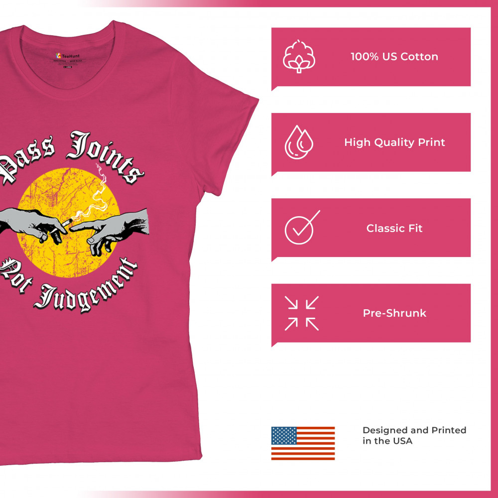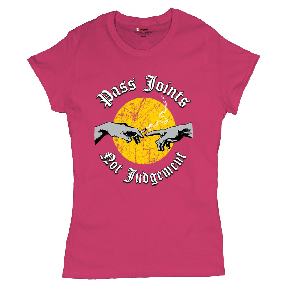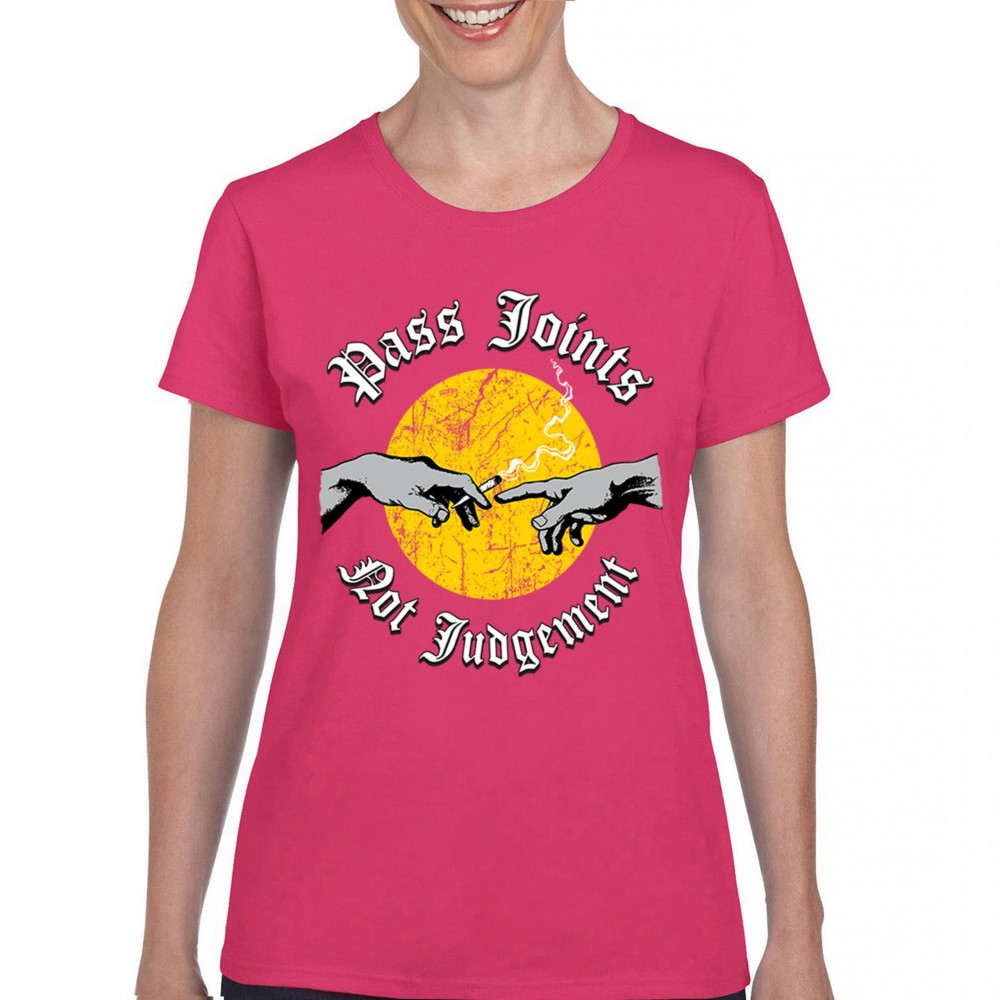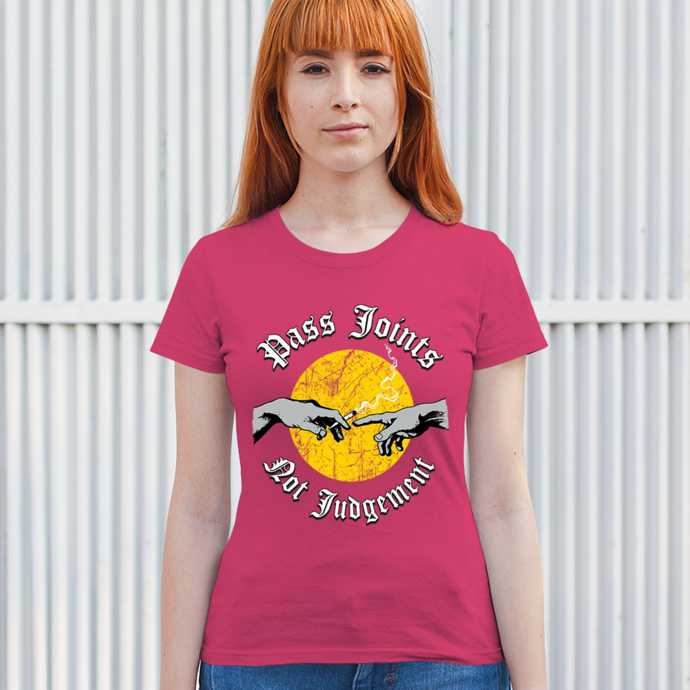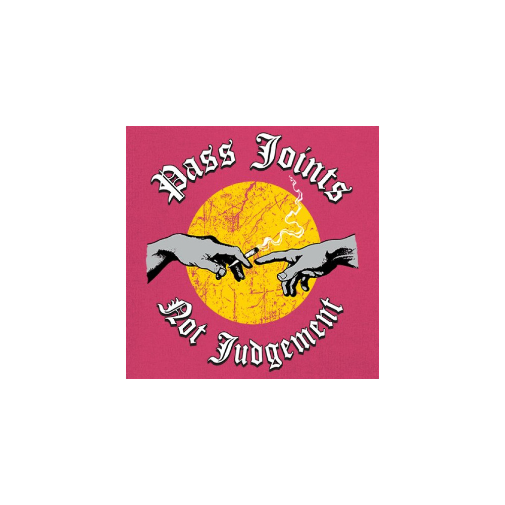 Cannabis culture twist on classic art. Hands passing a joint with “Pass Joints Not Judgement†message. Chill, bold, and unapologetically stoner.