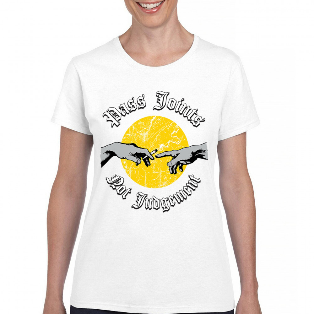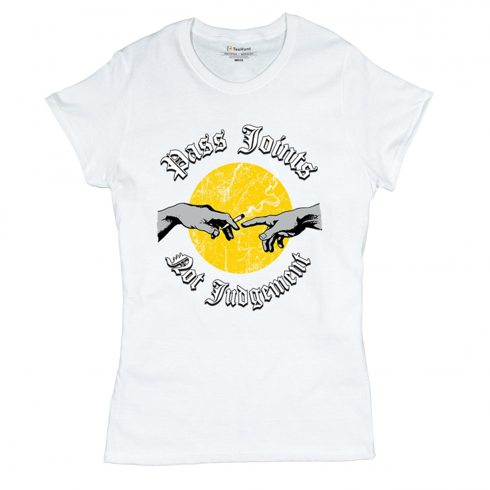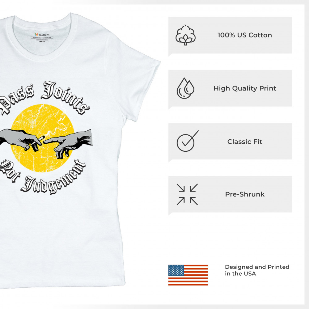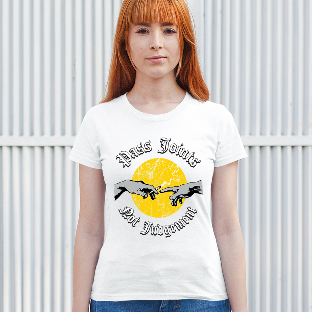 Cannabis culture twist on classic art. Hands passing a joint with “Pass Joints Not Judgement†message. Chill, bold, and unapologetically stoner.