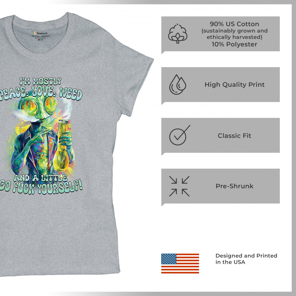 This bold alien stoner design fuses colorful weed art with raw honesty and stoner attitude. Featuring a high alien and vibrant peace love weed vibe, it's perfect for unapologetic smokers who blend kindness and truth. Wear it at festivals, smoke sessions, or whenever your mood is 80% peace, 20% sarcasm. It’s humor, cannabis culture, and bold energy rolled into one.