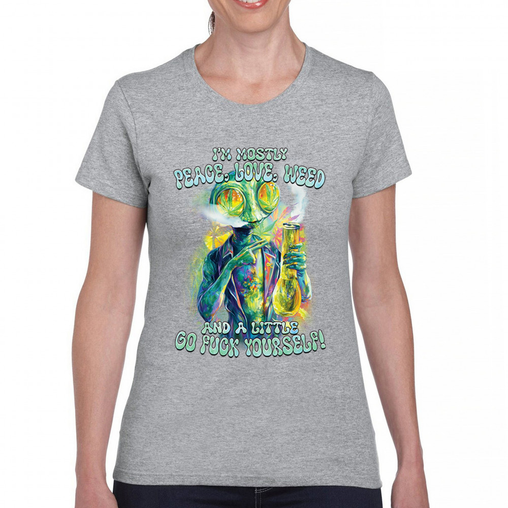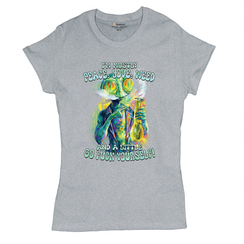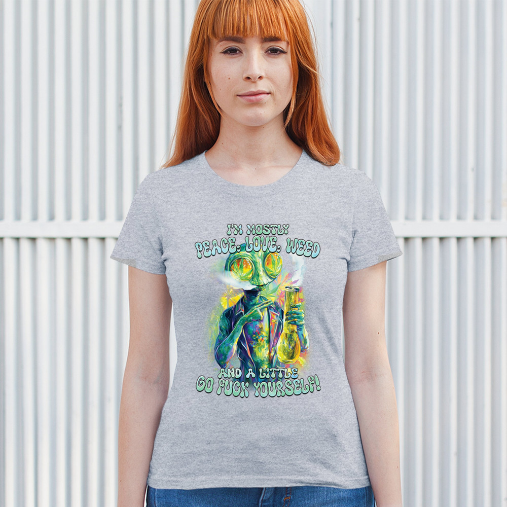 Bold alien cannabis design mixing humor, sarcasm, and weed culture—perfect for unapologetic smokers with attitude and peace vibes.