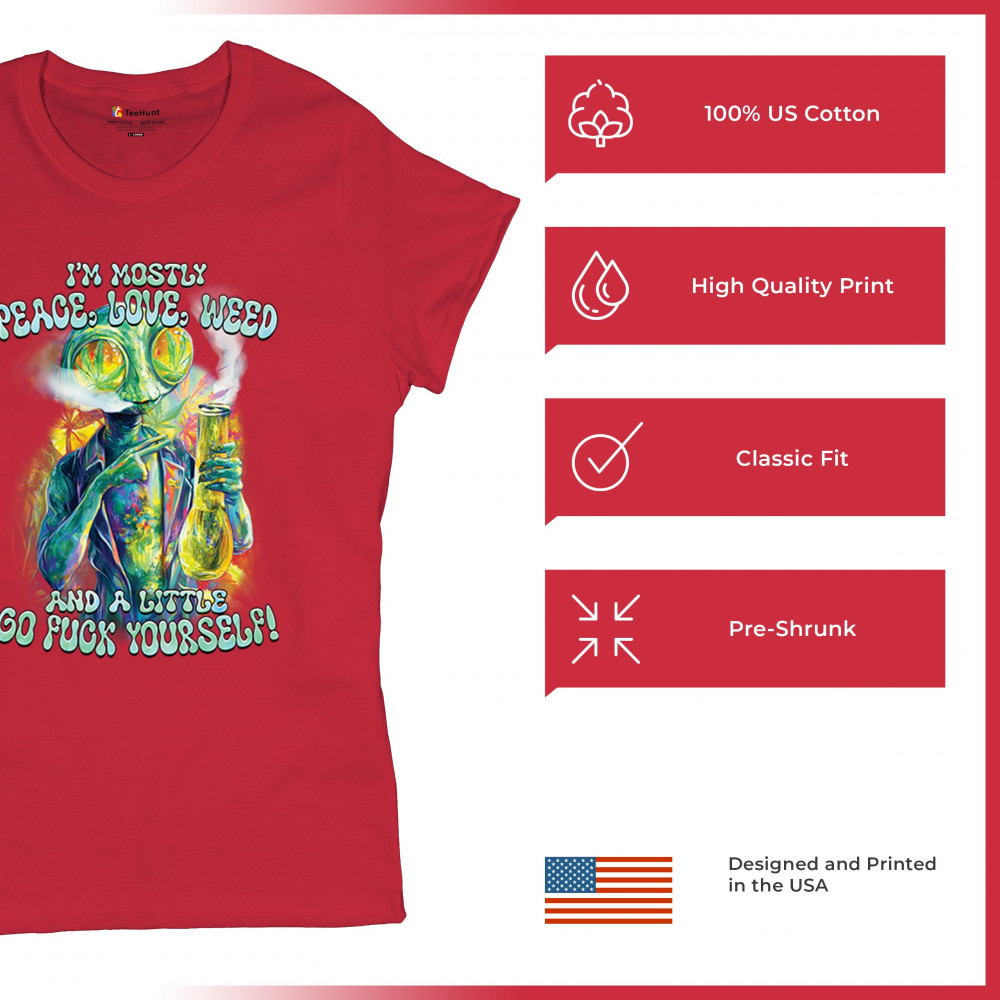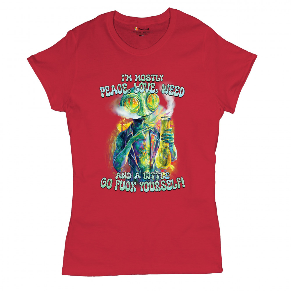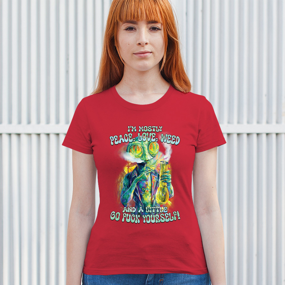 Bold alien cannabis design mixing humor, sarcasm, and weed culture—perfect for unapologetic smokers with attitude and peace vibes.