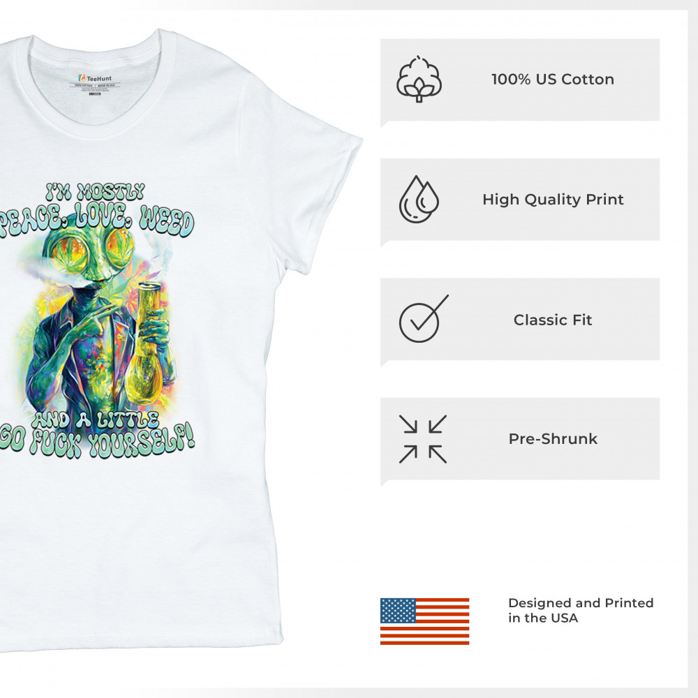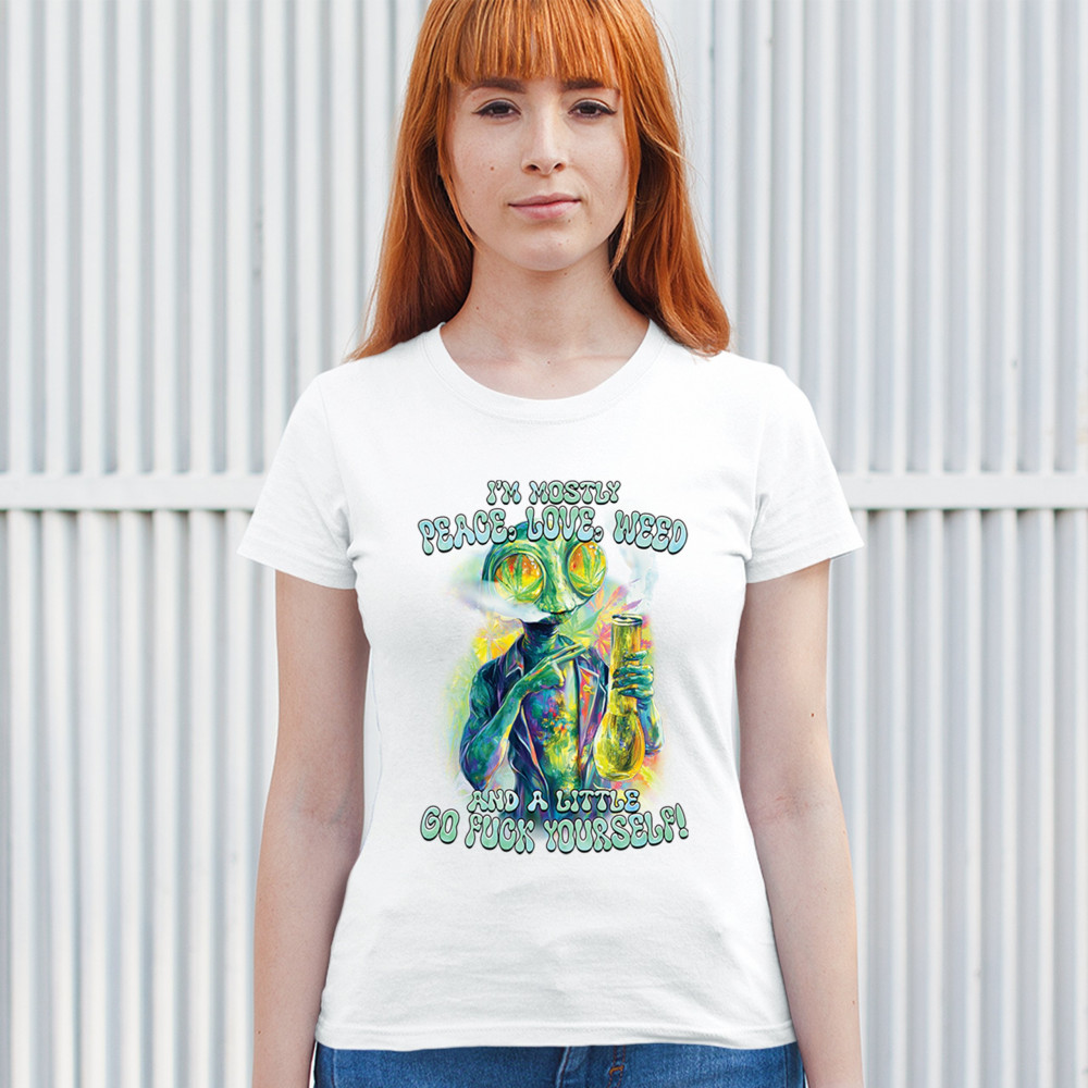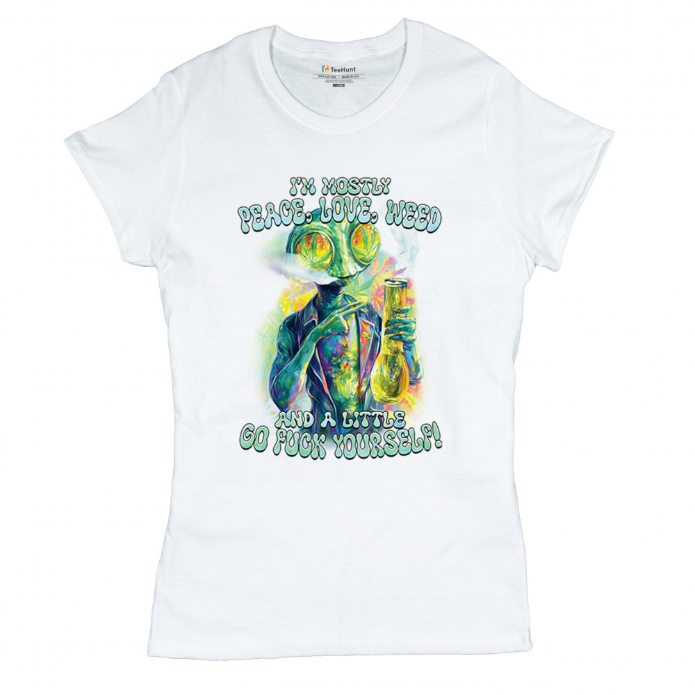 Bold alien cannabis design mixing humor, sarcasm, and weed culture—perfect for unapologetic smokers with attitude and peace vibes.
