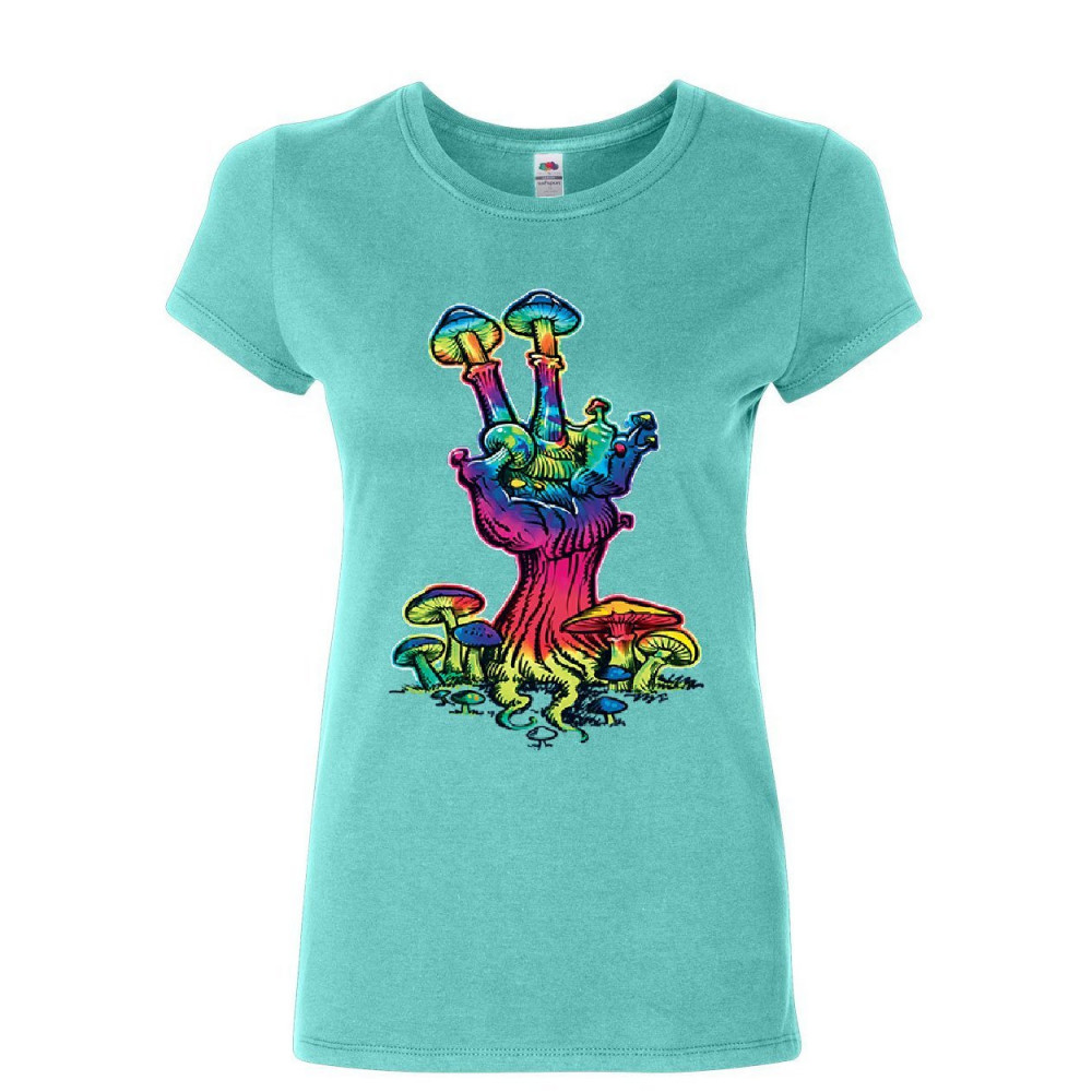 MUSHROOM PEACE peace mushroom women's t-shirt shroom hippie fungi colorful neon love shirt light blue