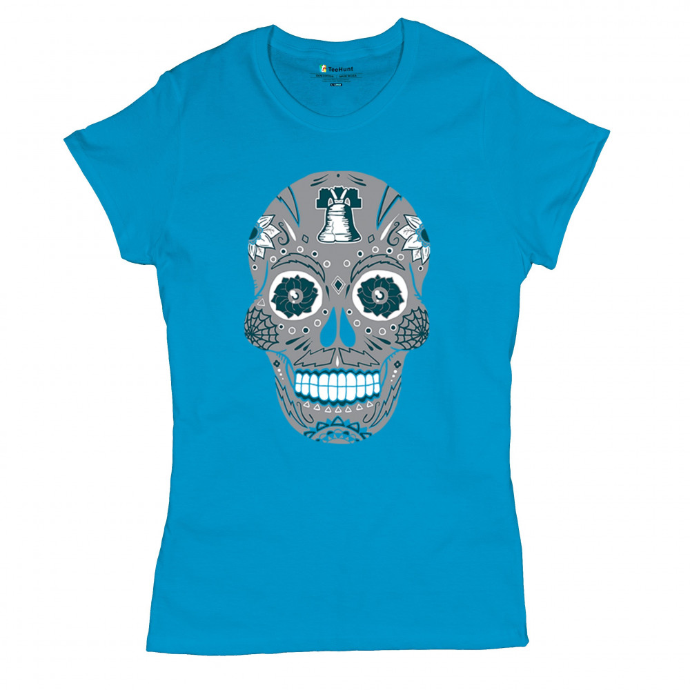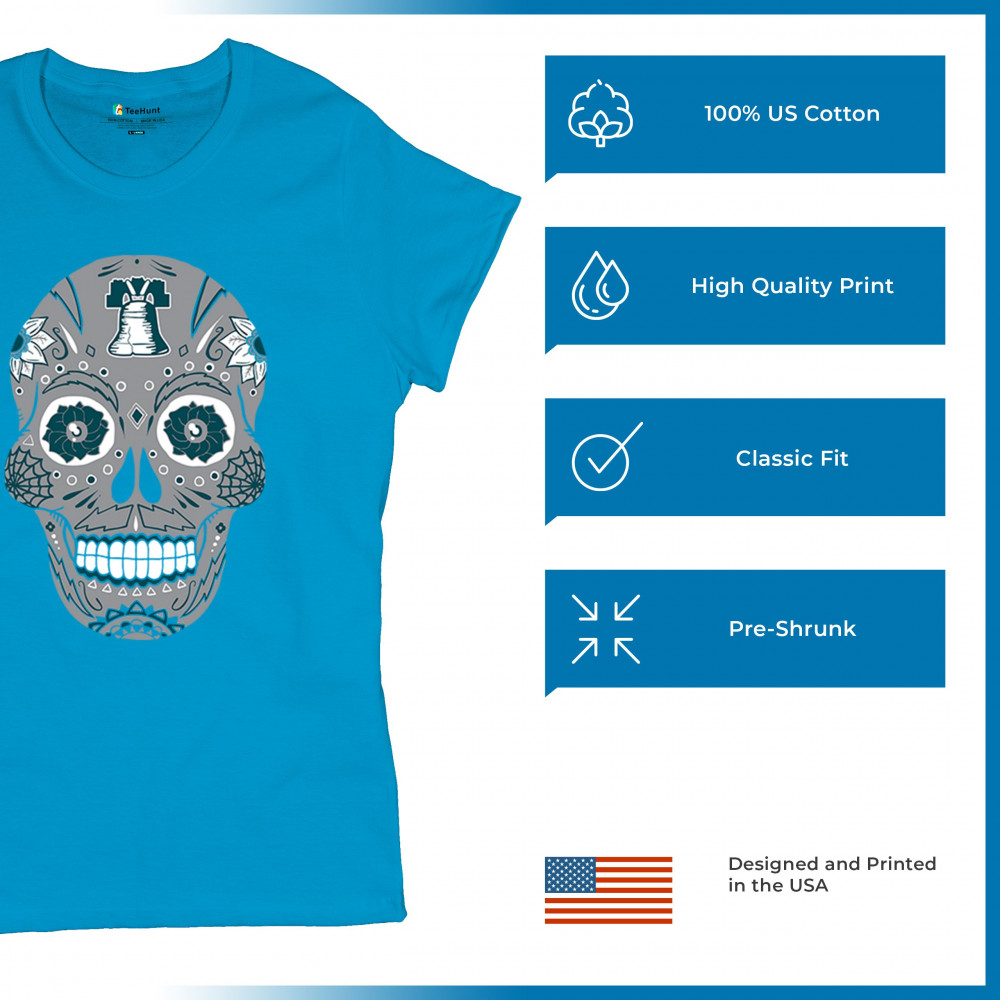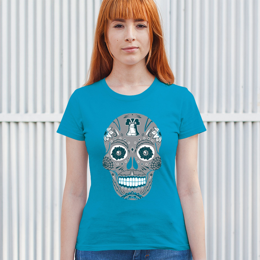 Philly meets tradition in this Sugar Skull design, mixing calavera art with the iconic liberty bell and marigold flowers. Perfect for Philly sports culture, fantasy league energy, or game day skull vibes, it captures Philly gothic art and fan zone spirit. A unique way to honor Dia de los Muertos while showing local Philadelphia pride and heritage in bold style.