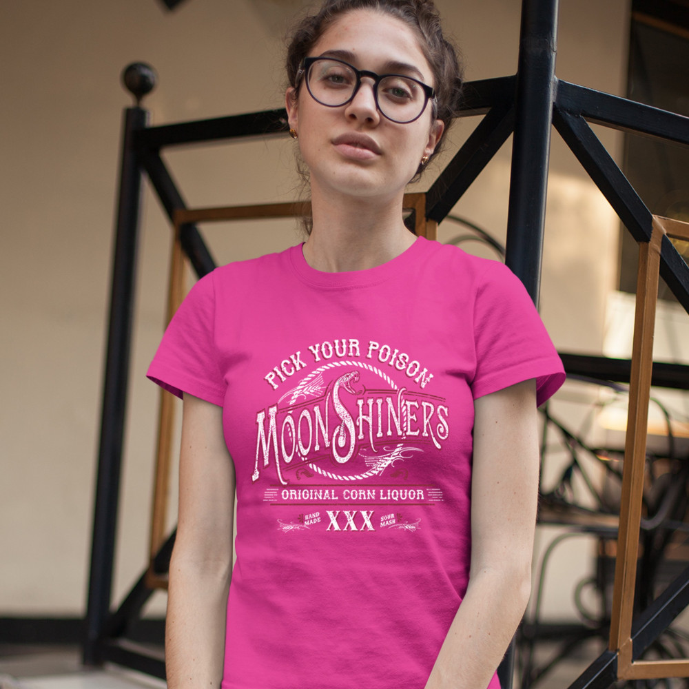 PICK YOUR POISON MOONSHINERS t-shirt original corn liquor xxx women's tee pink
