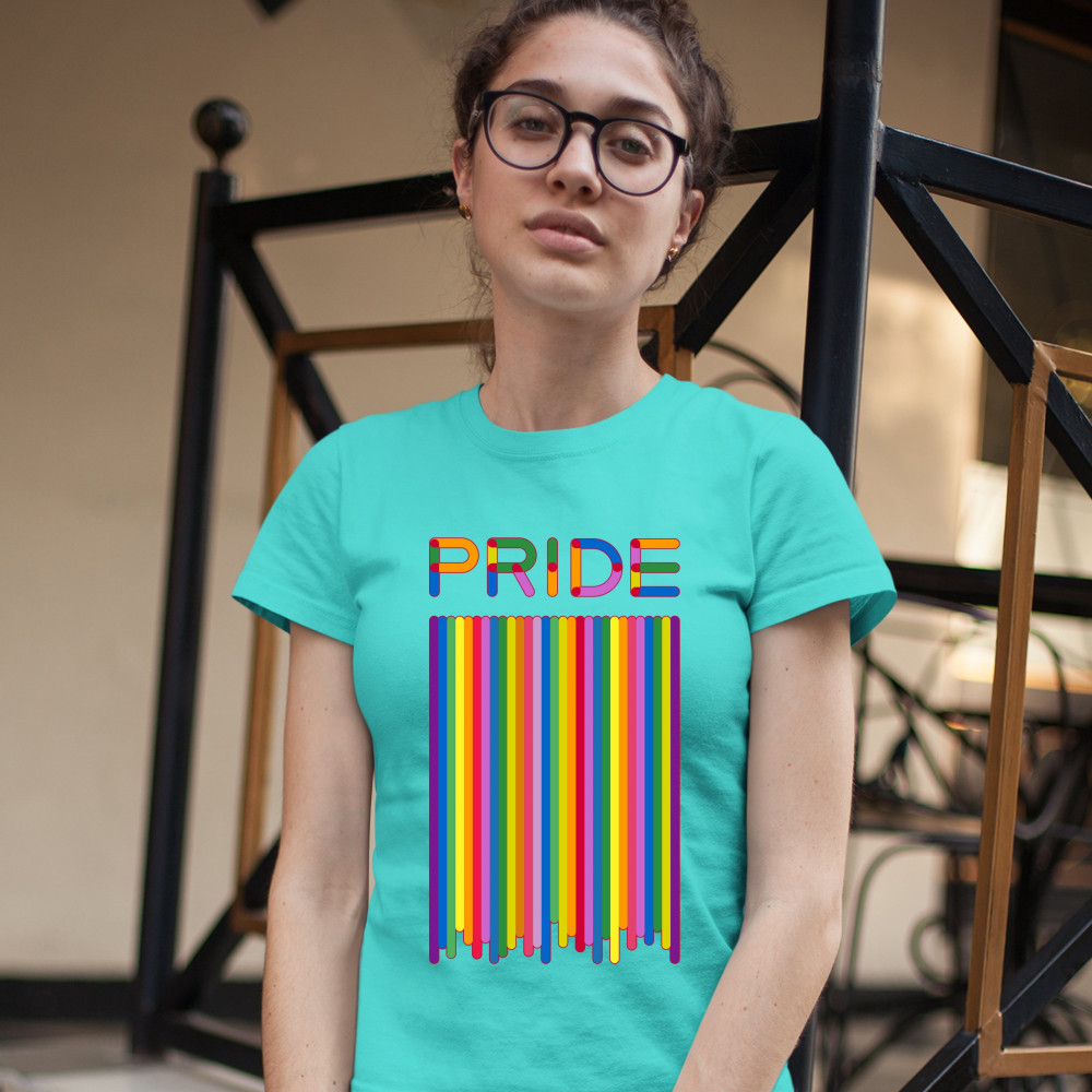 A print featuring a vertical flag painted in the colors of rainbow above which it says "Pride". Great choice to wear as a proud queer person.