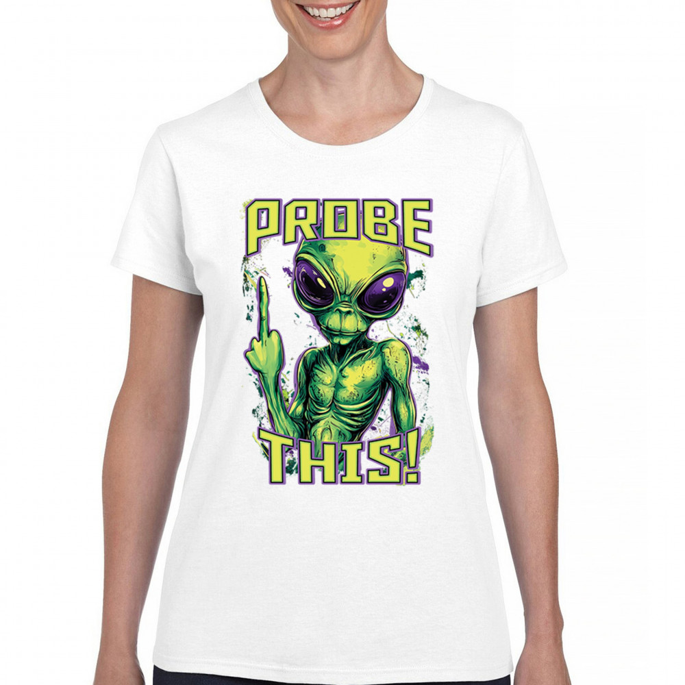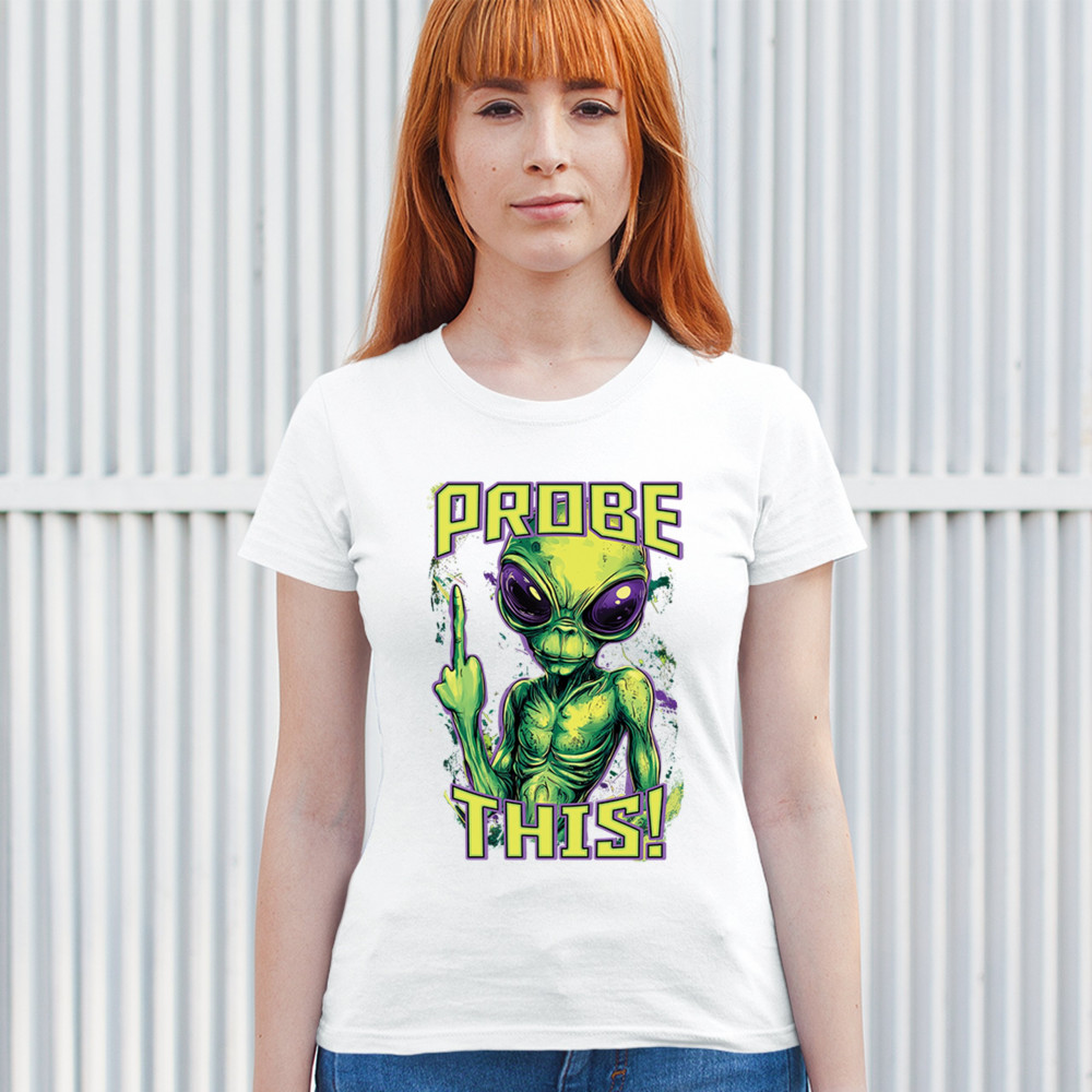 Alien attitude goes full throttle in this rebellious design featuring a defiant extraterrestrial flipping the bird. Bold green and purple tones amplify the sarcasm, making it perfect for UFO fans, protest vibes, and anyone with a dark sense of humor. Wear it loud to alien fests, parties, or anytime you want to stir the stars.