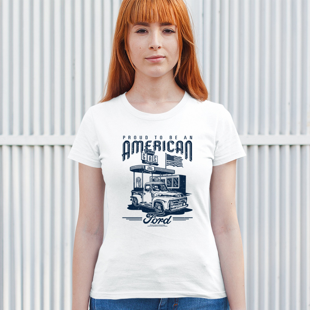 Celebrate Ford's legacy with this vintage 1950s F-Series truck design featuring an American flag. A perfect gift for Ford and classic car enthusiasts.