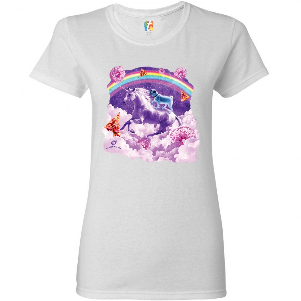 A beautiful print featuring a pug standing on a back of a unicorn galloping through clouds. In the background a rainbow crossing the space is seen. Across the clouds numerous pizza slices and donuts are scattered. A great choice for a person who loves pug