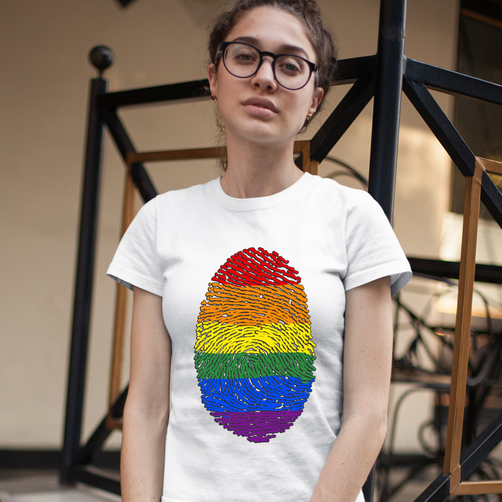 A print featuring a fingerprint painted in rainbow colors. Great choice to wear as a proud queer person.