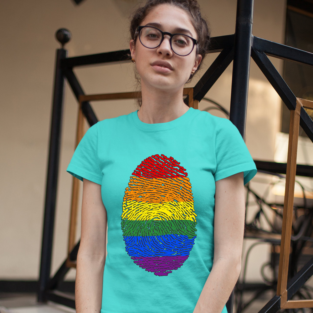 A print featuring a fingerprint painted in rainbow colors. Great choice to wear as a proud queer person.