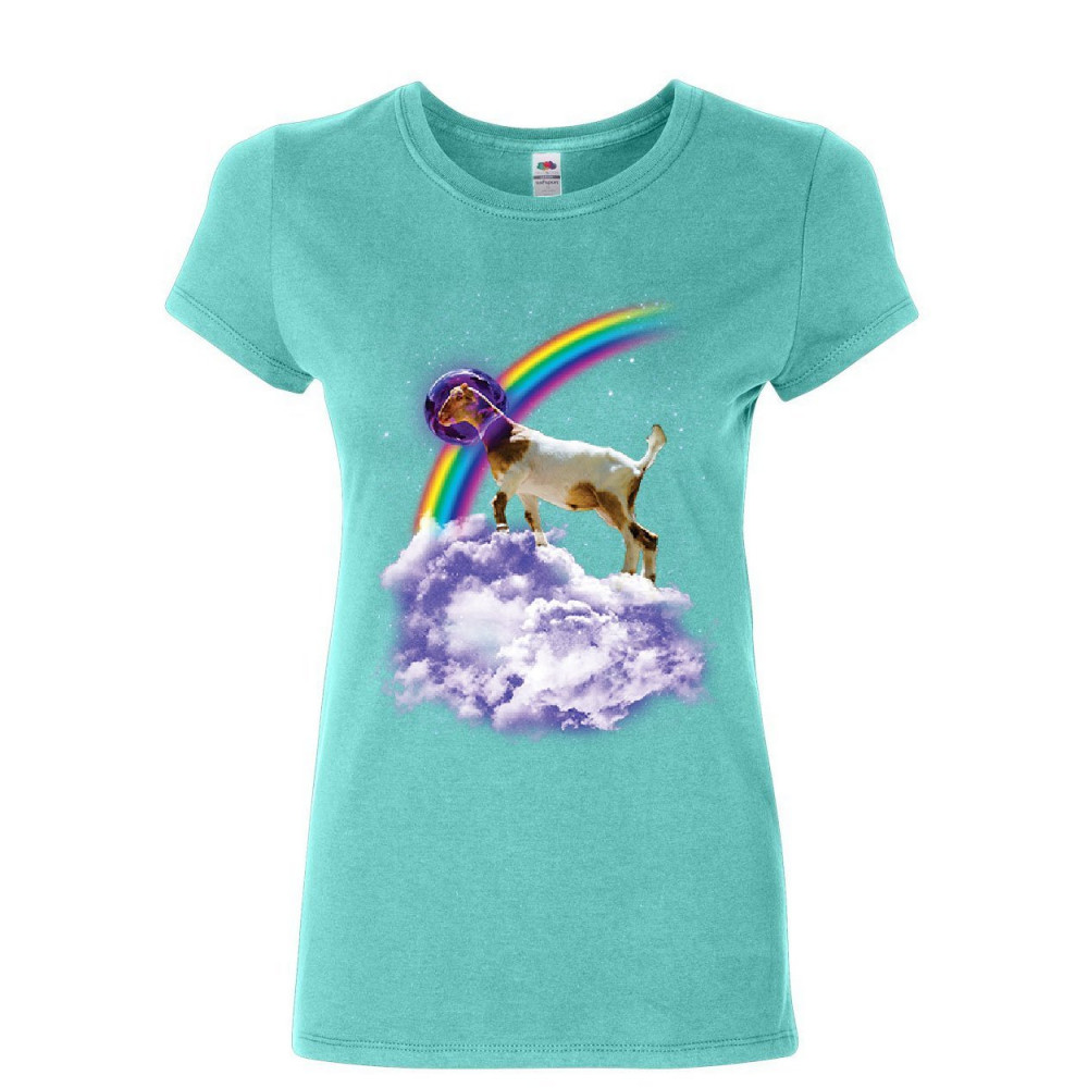 RAINBOW GOAT ON A CLOUD women's t-shirt galaxy space funny universe gag shirt light blue