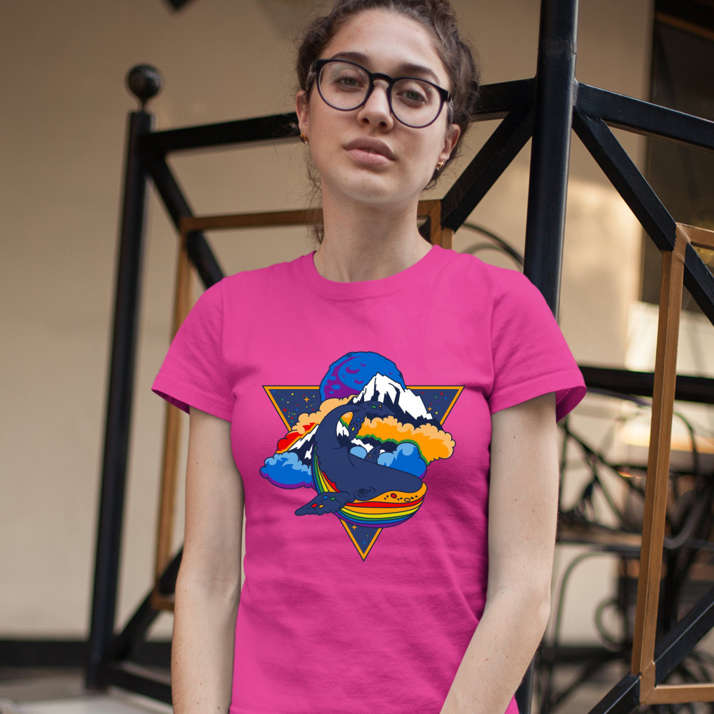A print featuring a whale with a rainbow-colored belly. Behind it there are mountains in the clouds, an asteroid and a triangle frame through which space is seen. Great choice to wear as a proud queer person.
