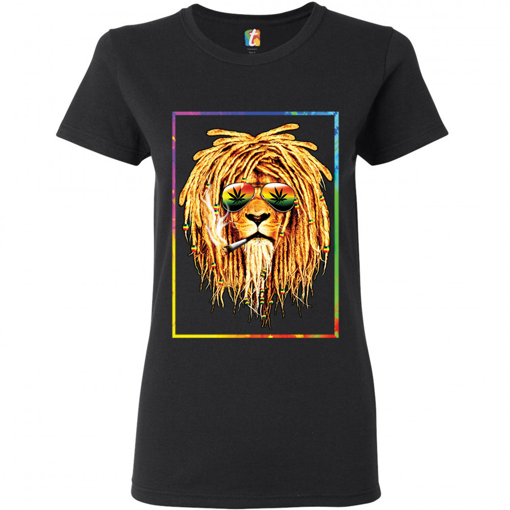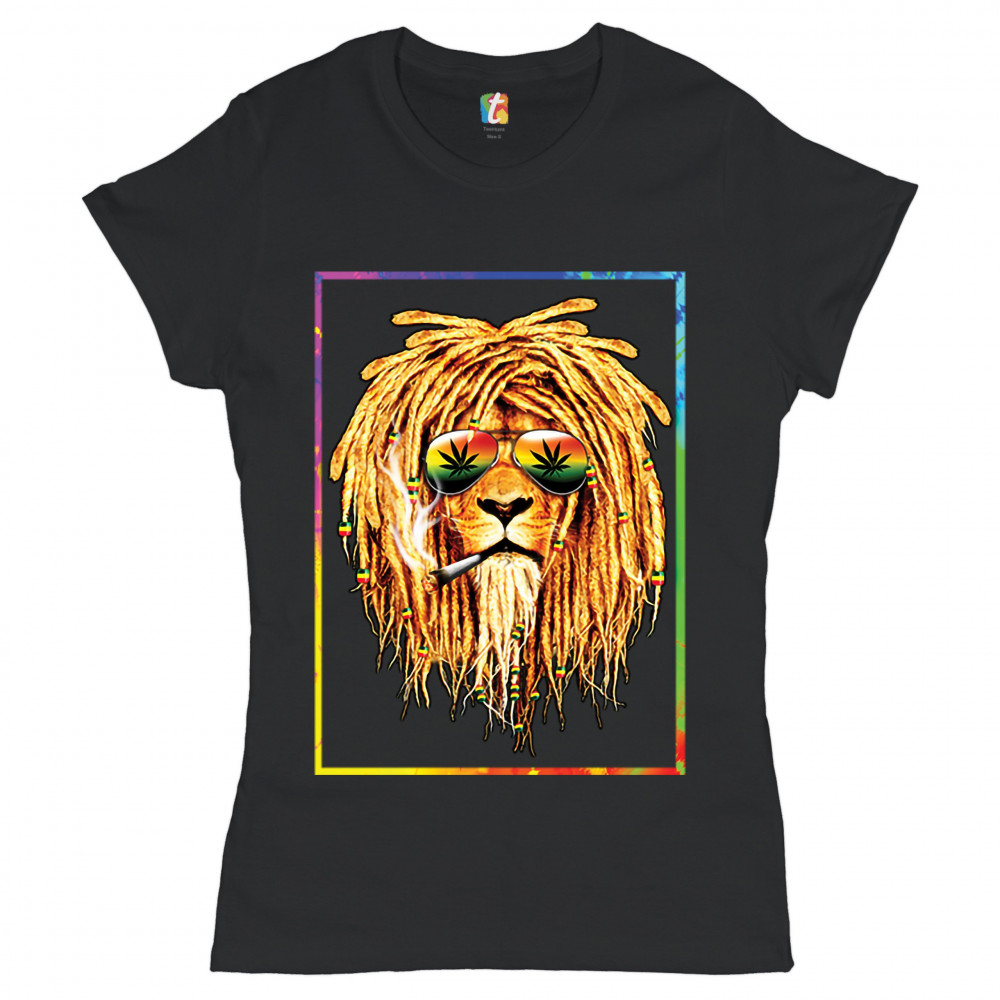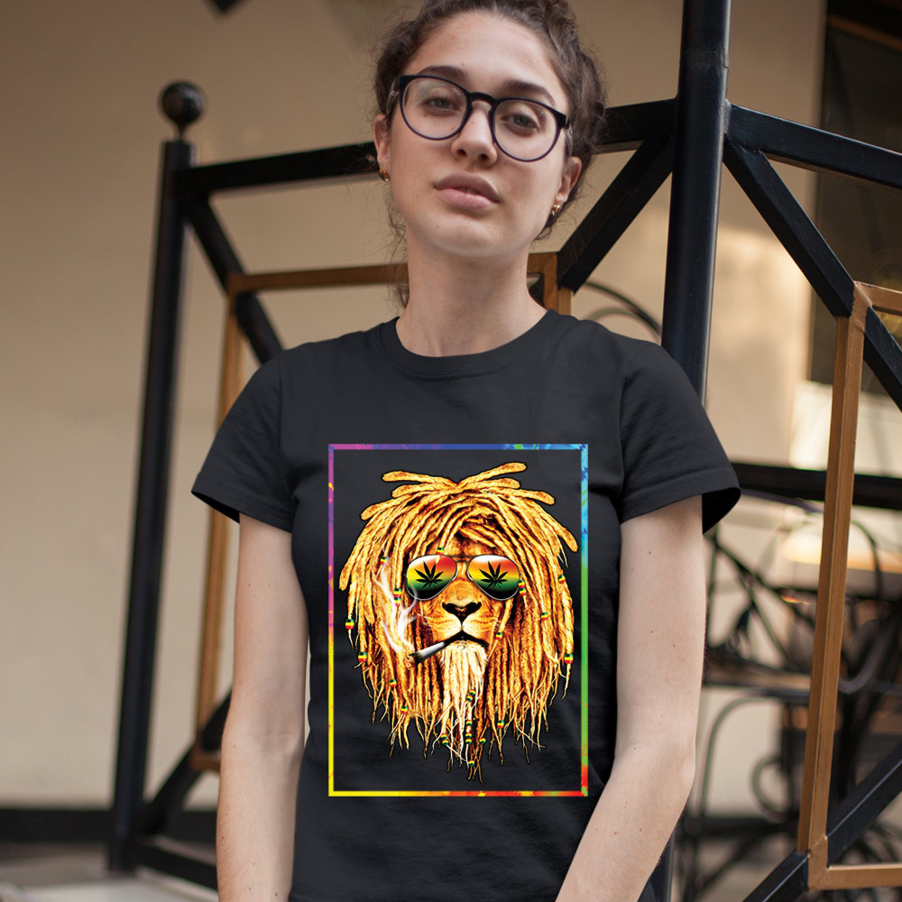 A print featuring a lion with dreadlocks smoking a joint and wearing sunglasses with marijuana leaves reflected in the them. The beads on the lion's dreadlocks and the glasses are painted with traditional Jamaican colors. Great choice for a pot aficionado