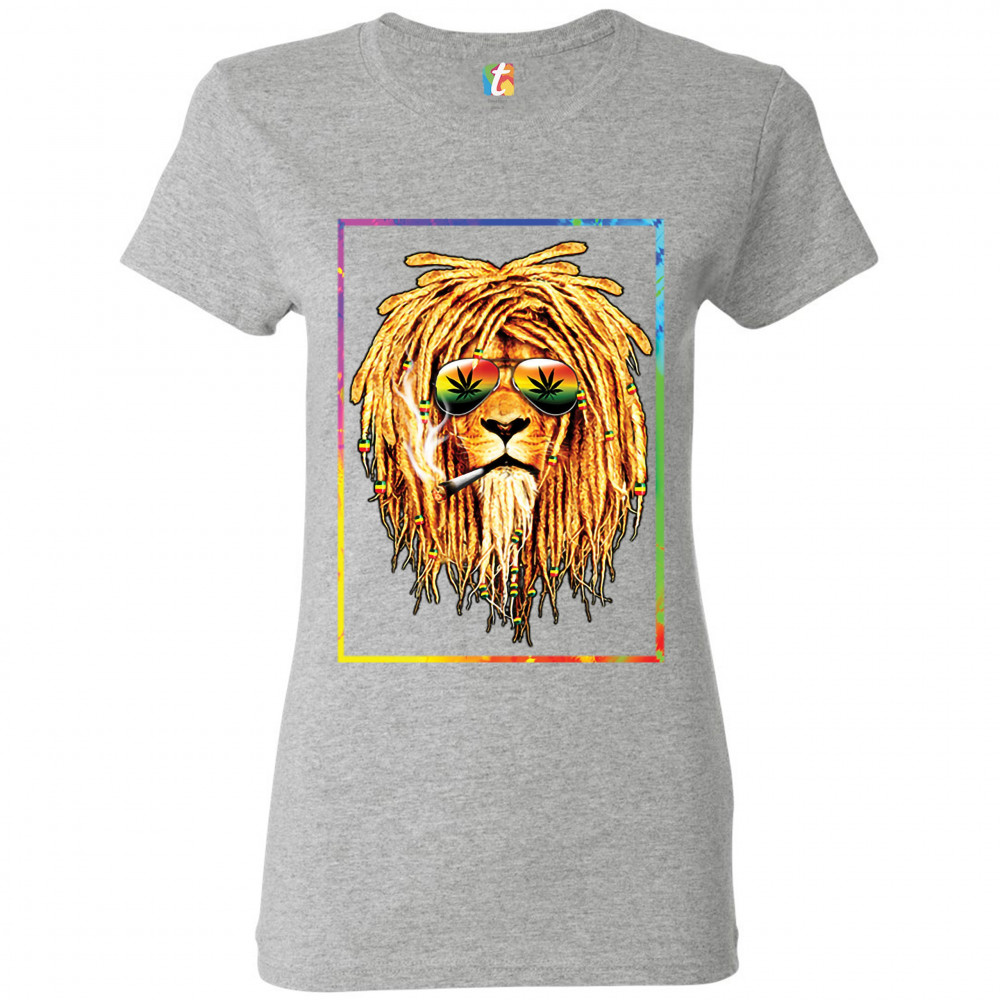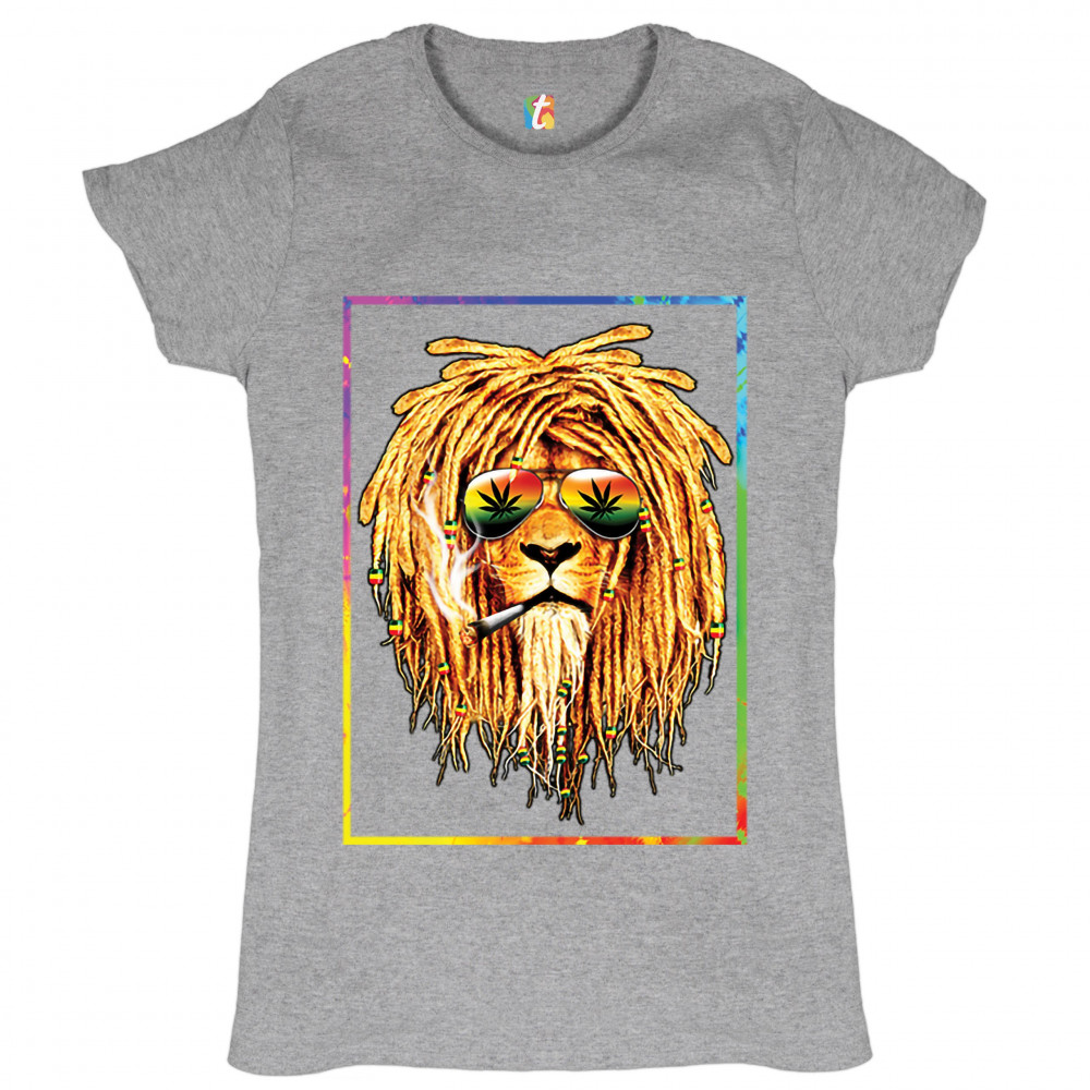 A print featuring a lion with dreadlocks smoking a joint and wearing sunglasses with marijuana leaves reflected in the them. The beads on the lion's dreadlocks and the glasses are painted with traditional Jamaican colors. Great choice for a pot aficionado