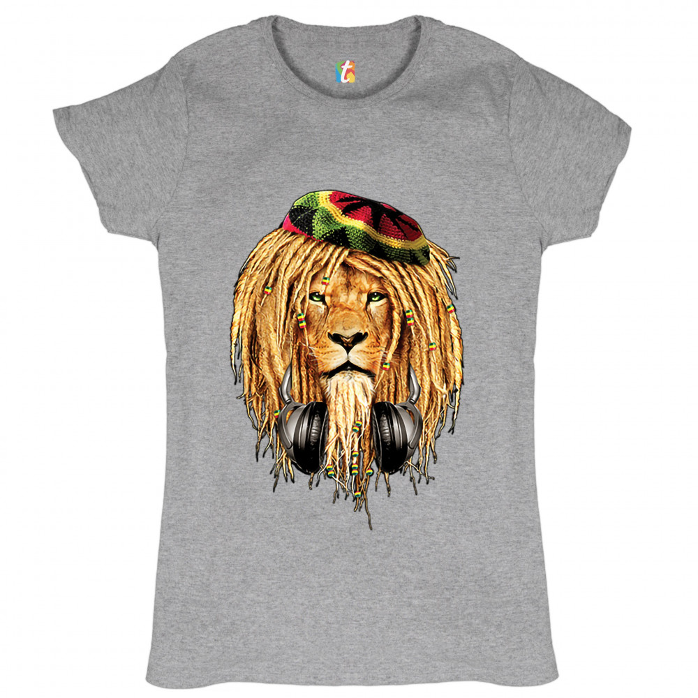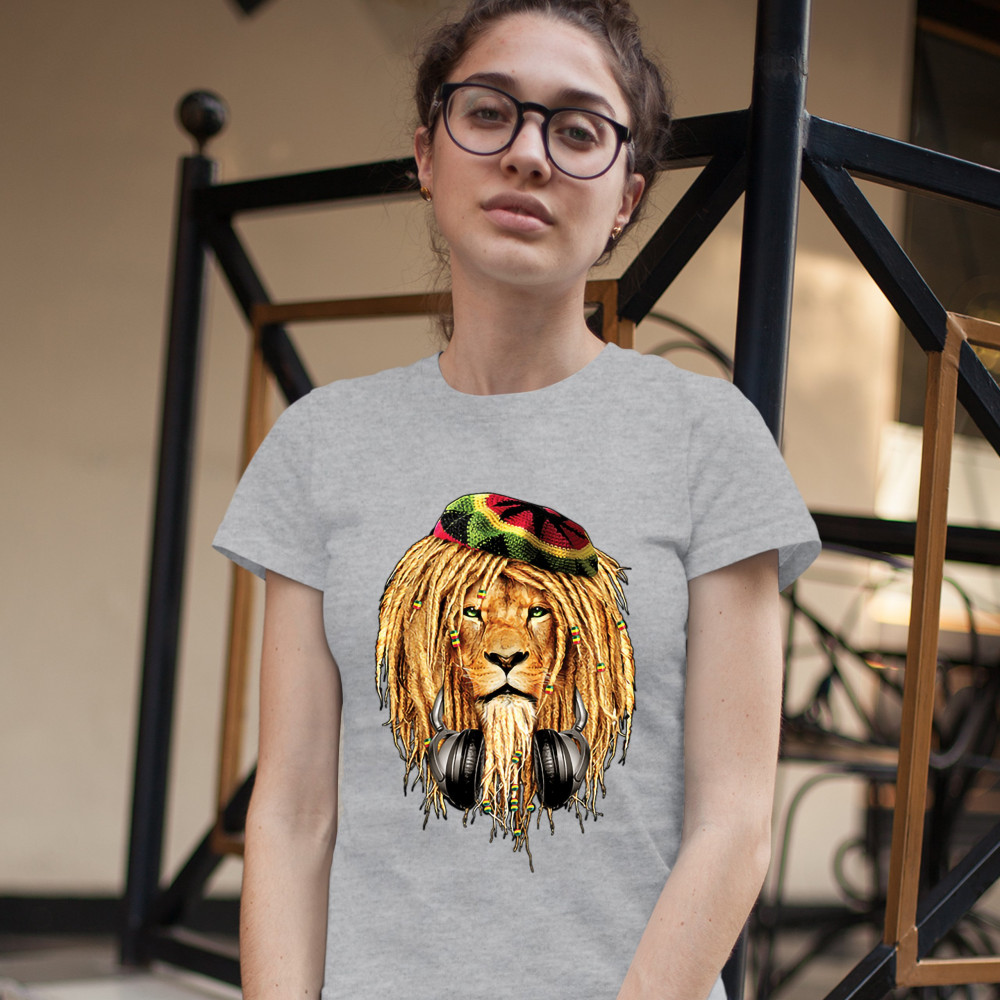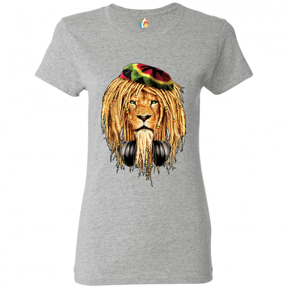 RASTA LION WITH HEADPHONES t-shirt jah jamaica reggae 420 culture women's tee gray