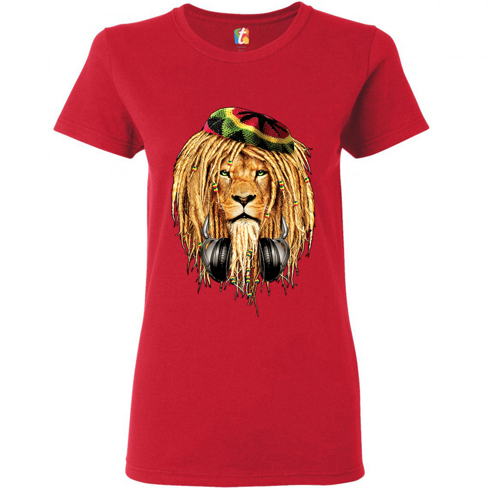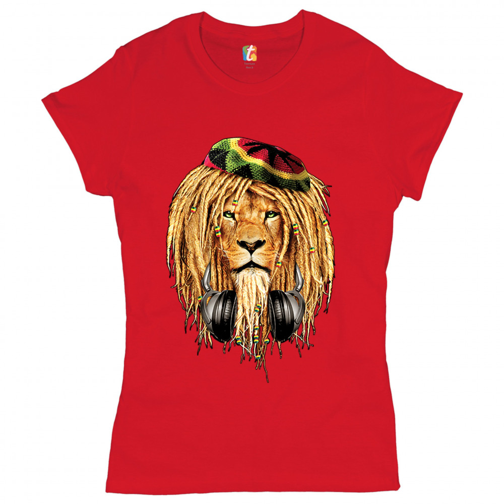 RASTA LION WITH HEADPHONES t-shirt jah jamaica reggae 420 culture women's tee red