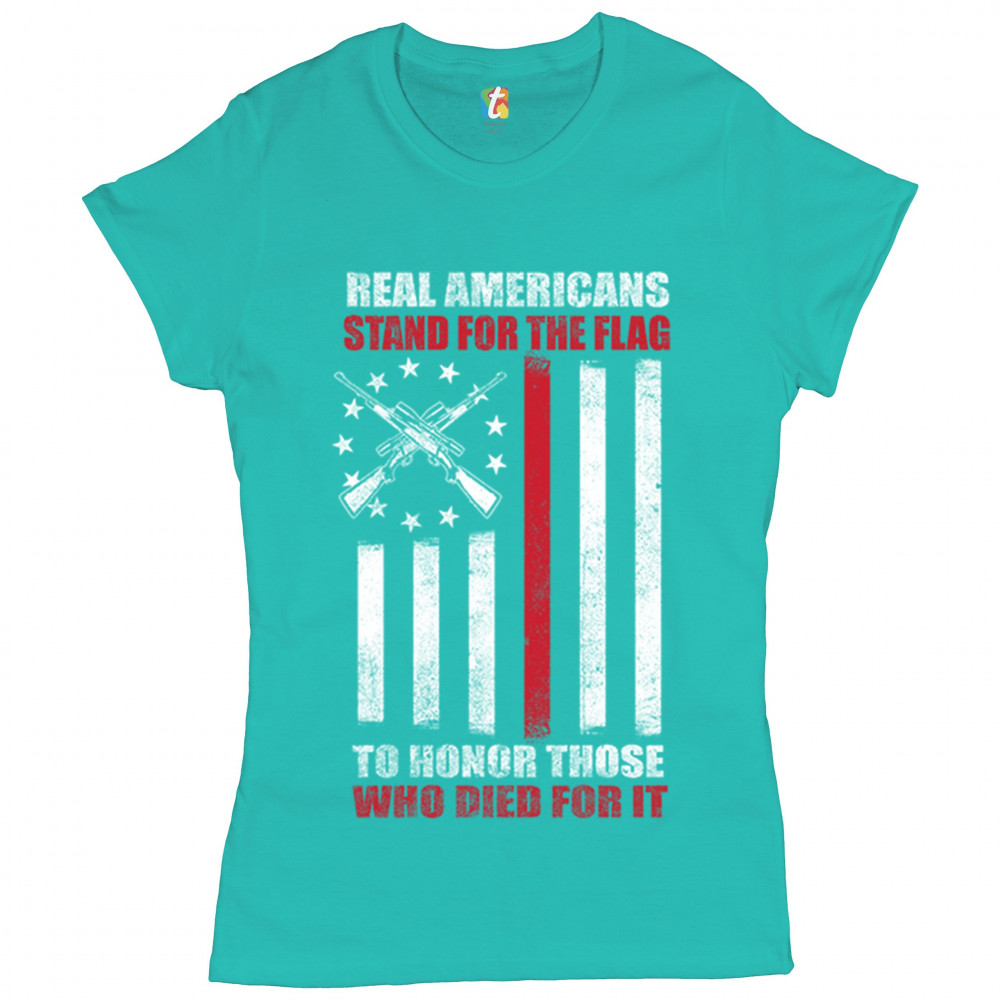 REAL AMERICANS STAND FOR THE FLAG t-shirt patriotic veteran's day women's tee light blue