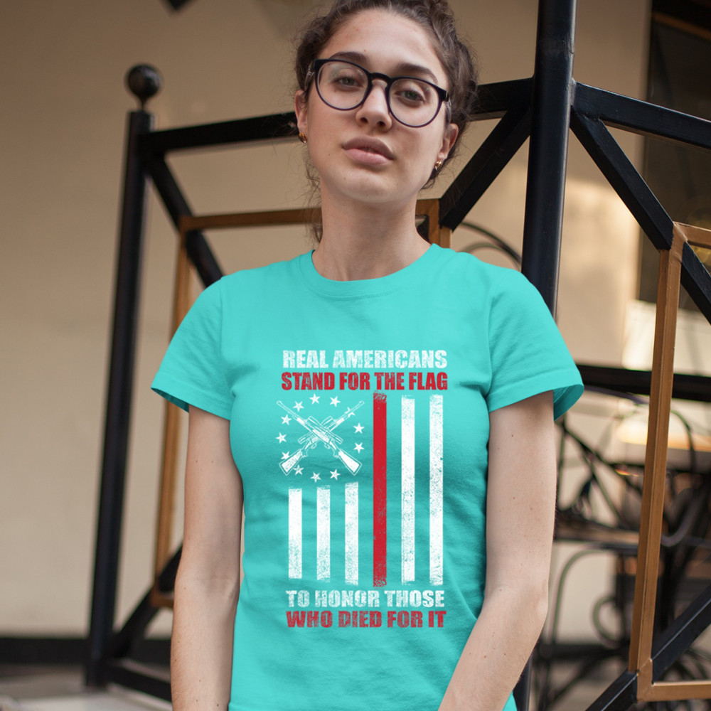 A patriotic print saying "Real Americans Stand for the Flag To Honor Those Who Died for It" and featuring a Betsy Ross American Flag with two crossed rifles inside the circle of stars and a thin red line insted of one of the stripes. Great choice to wear