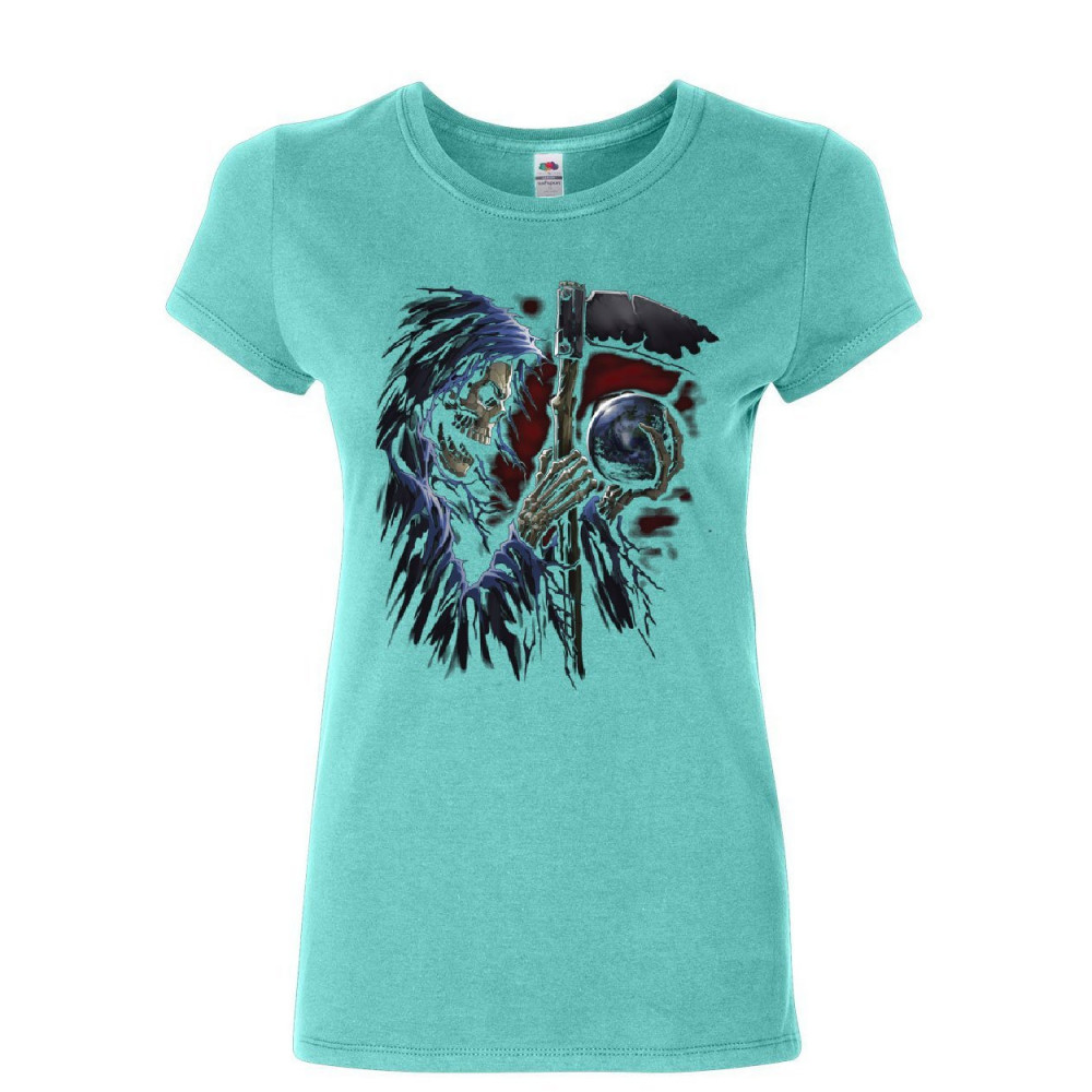 REAPER SPHERE SCYTHE women's t-shirt death skull creepy scary monster shirt light blue